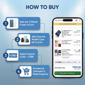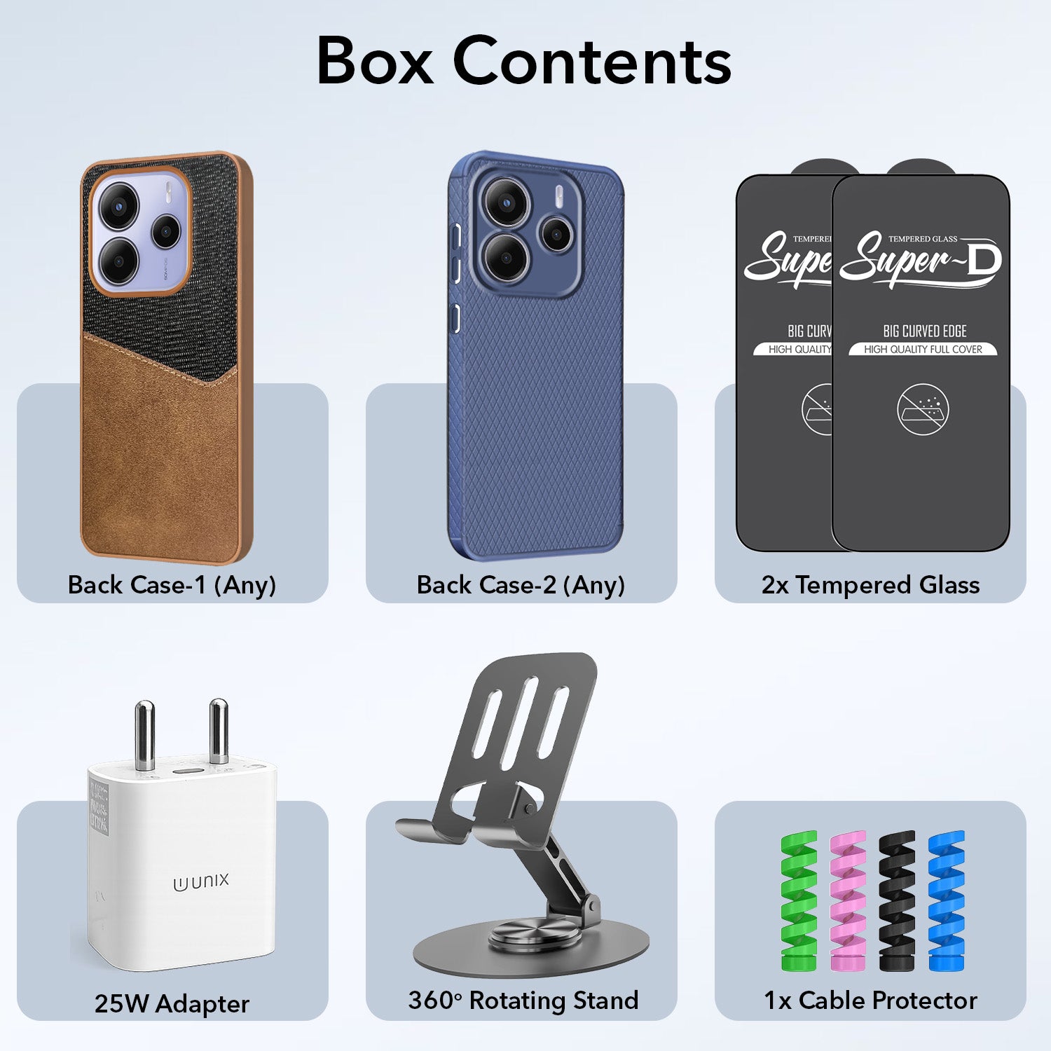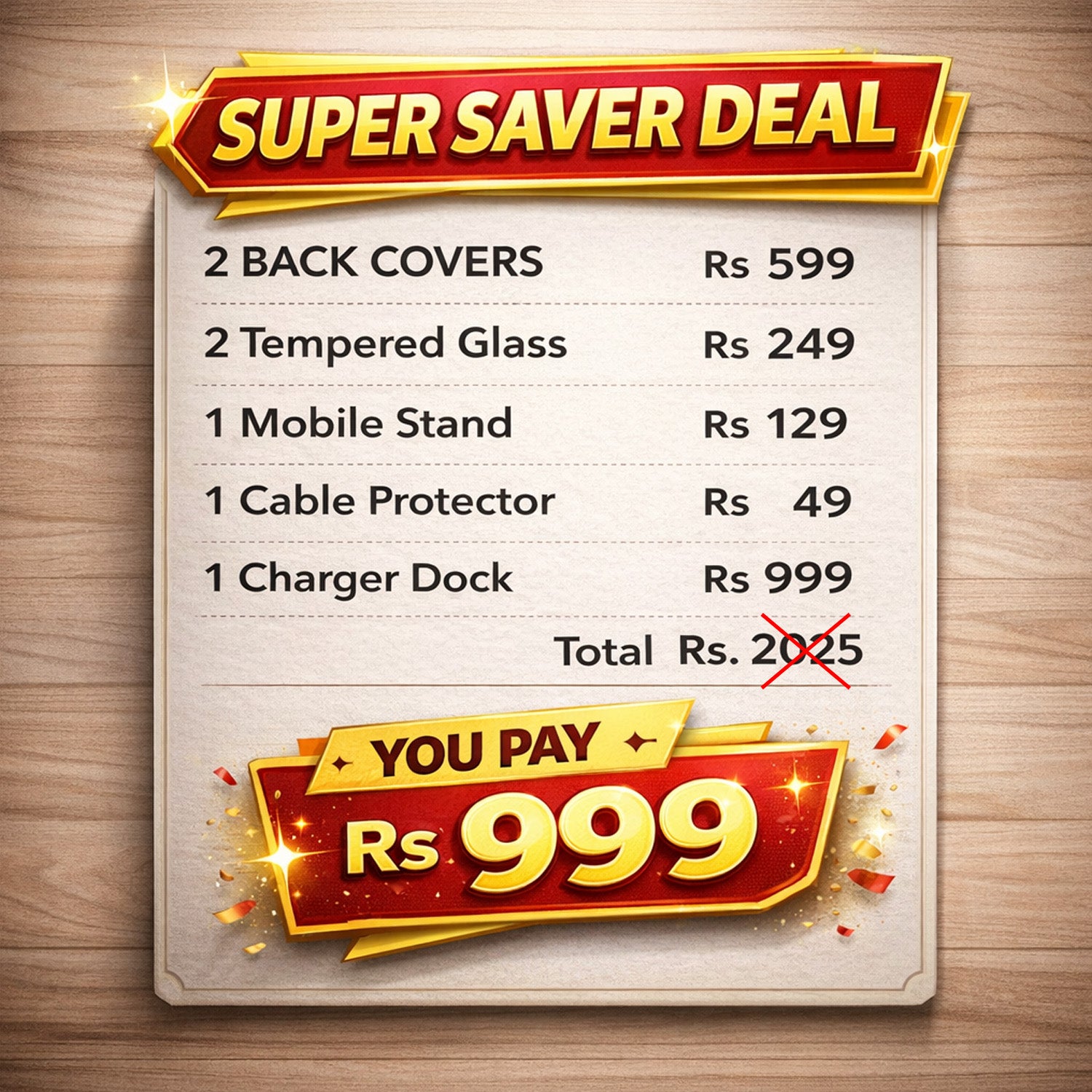 Complete Mobile Care Kit (Get Any 2 Cases+2 Tempered Glass+25W Charger Adapter+Metallic Mobile Stand+Cable Protector)