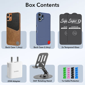 Complete Mobile Care Kit (Get Any 2 Cases+2 Tempered Glass+25W Charger Adapter+Metallic Mobile Stand+Cable Protector)