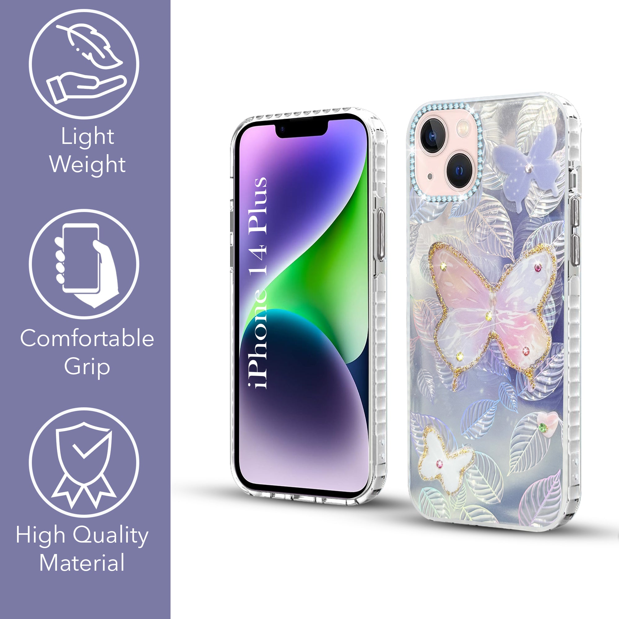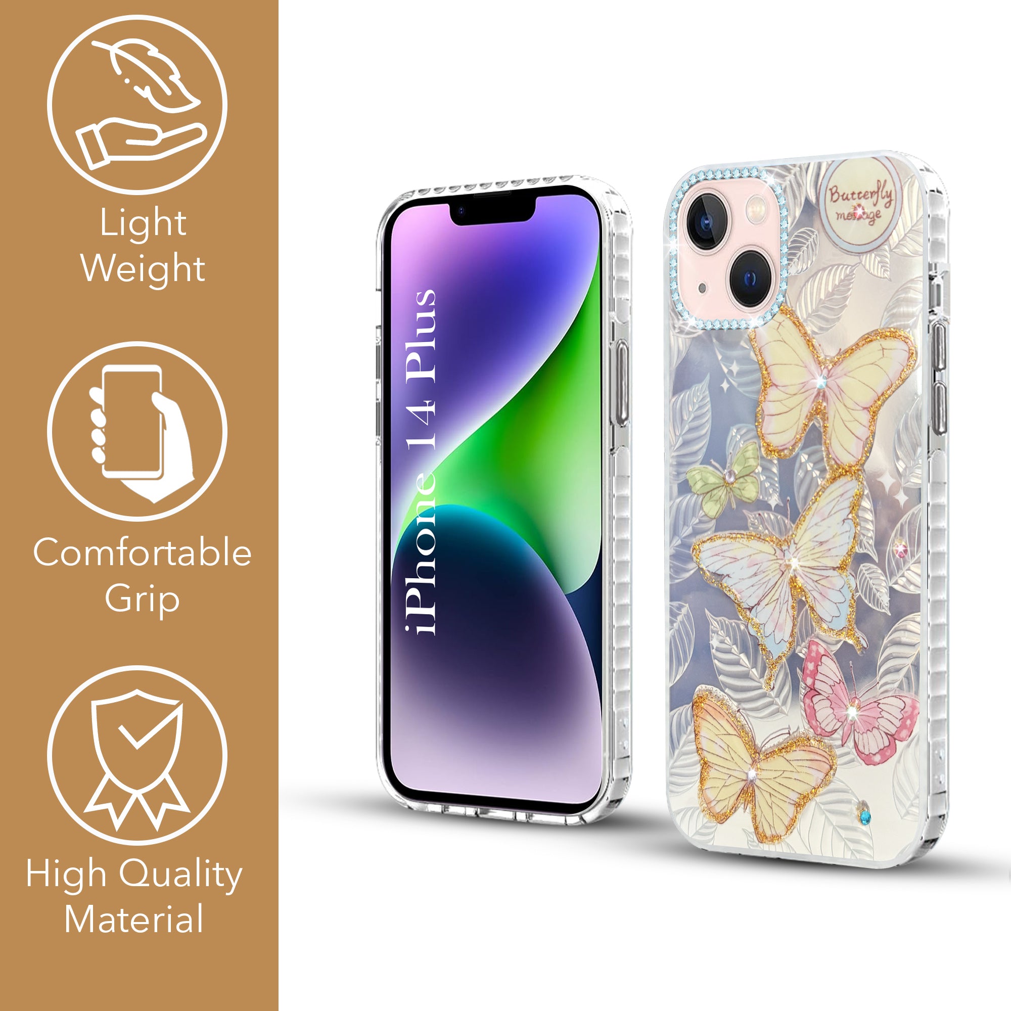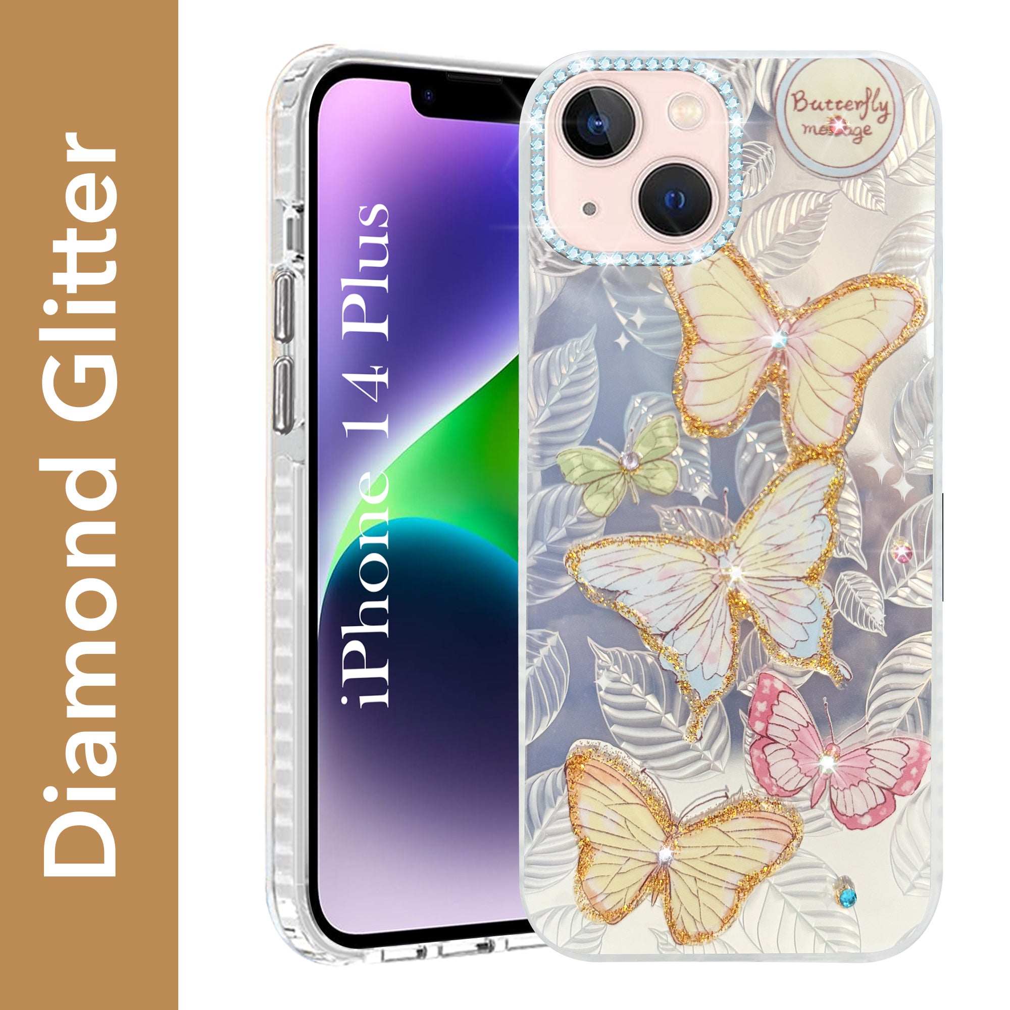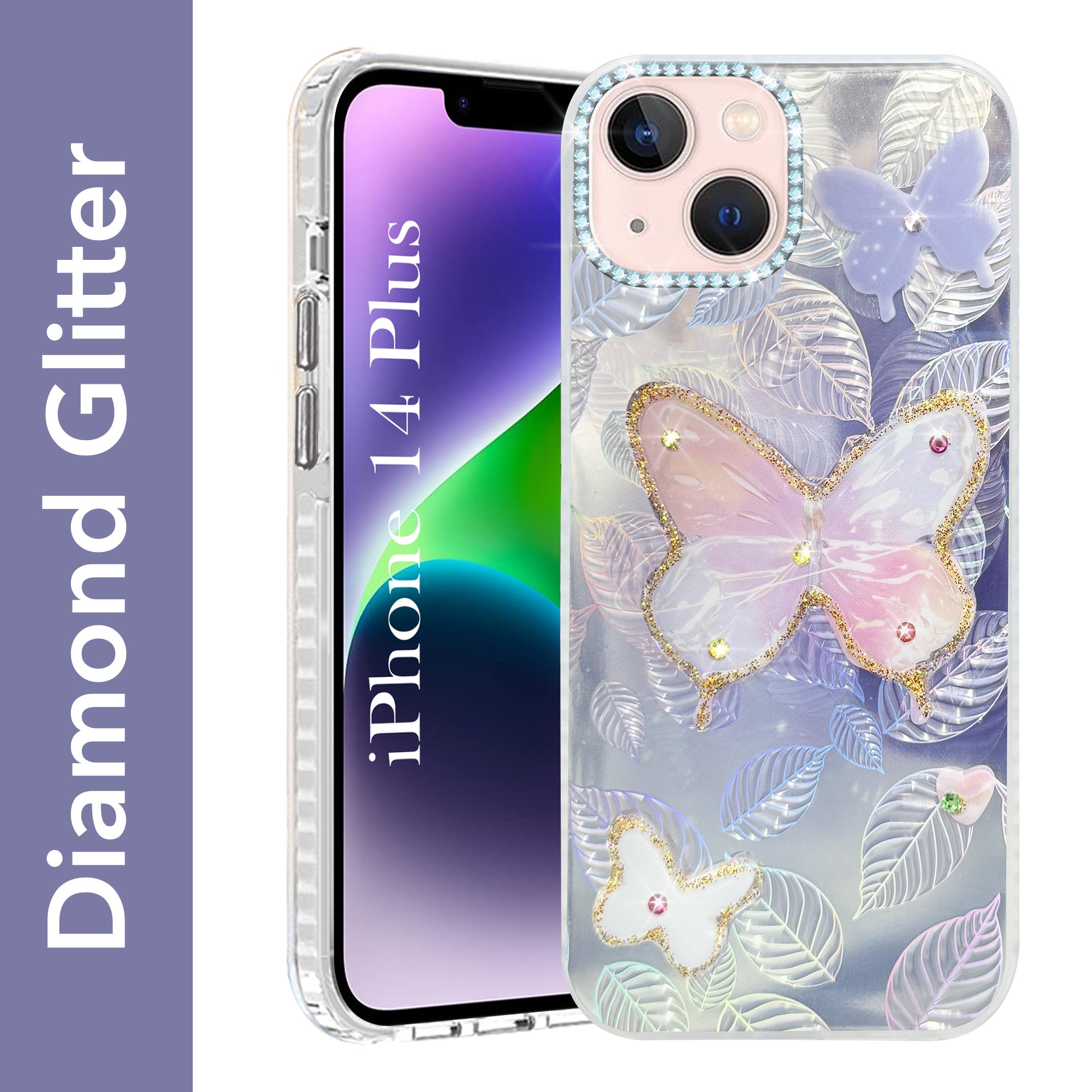 For Apple iPhone 14 Plus Back Cover Case (Luxury Floral Glitter Cute Butterfly | Diamond Studded Camera Bump | Girls & Women Design)