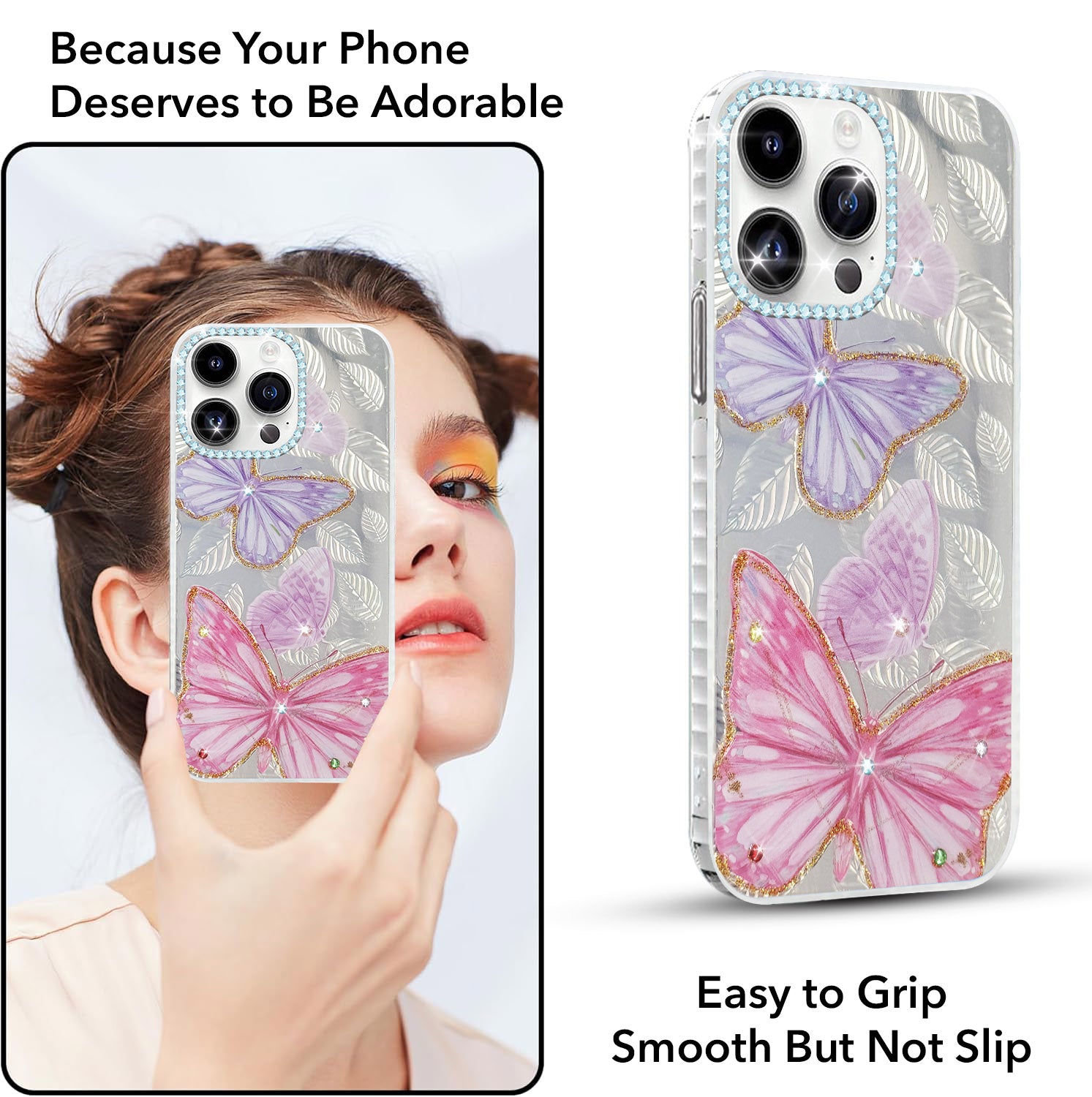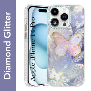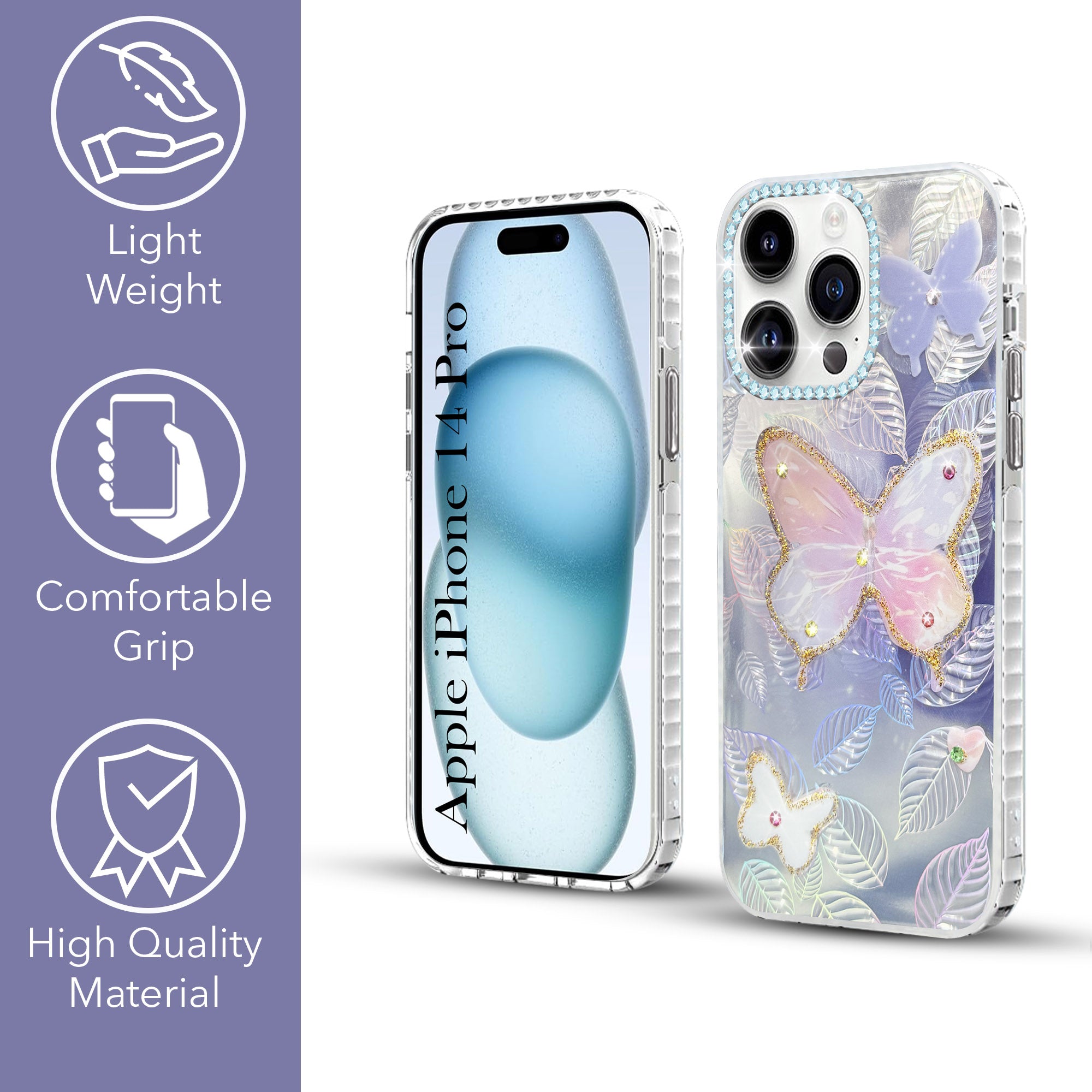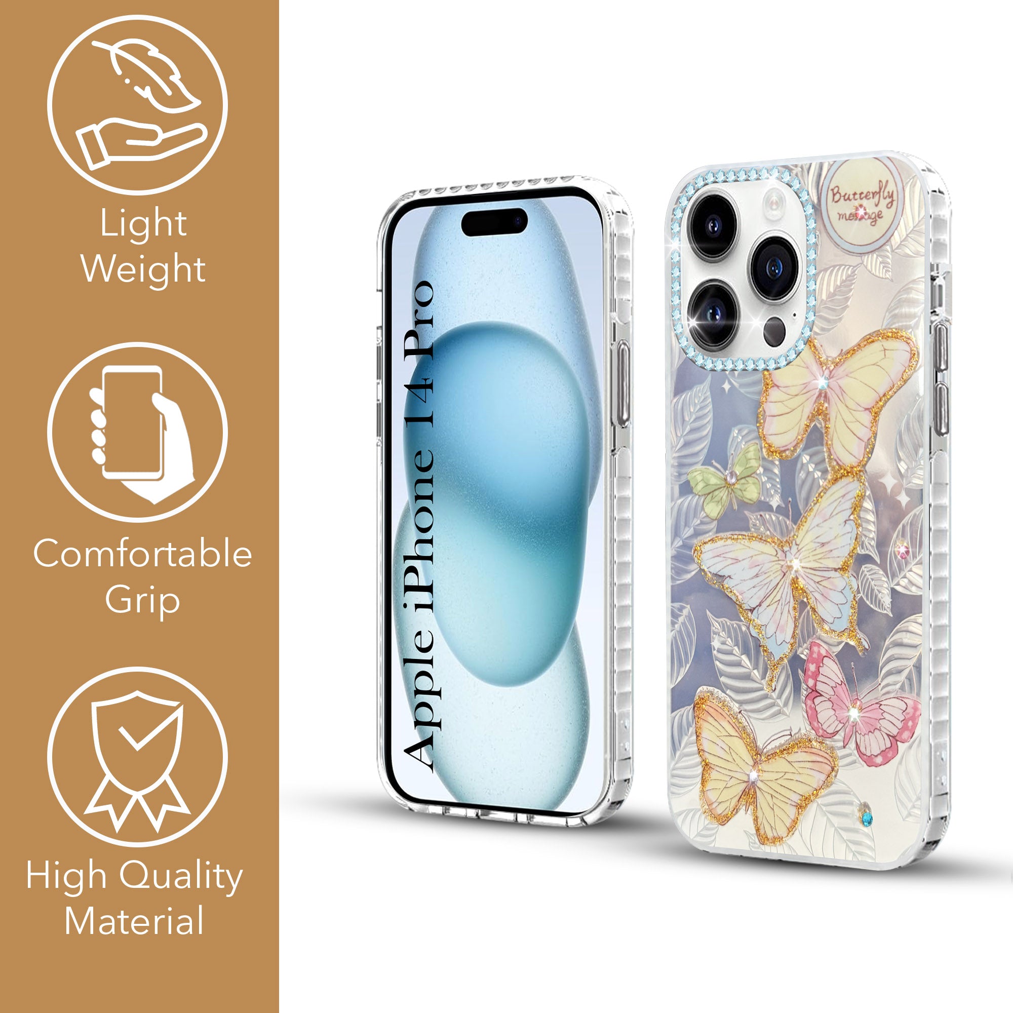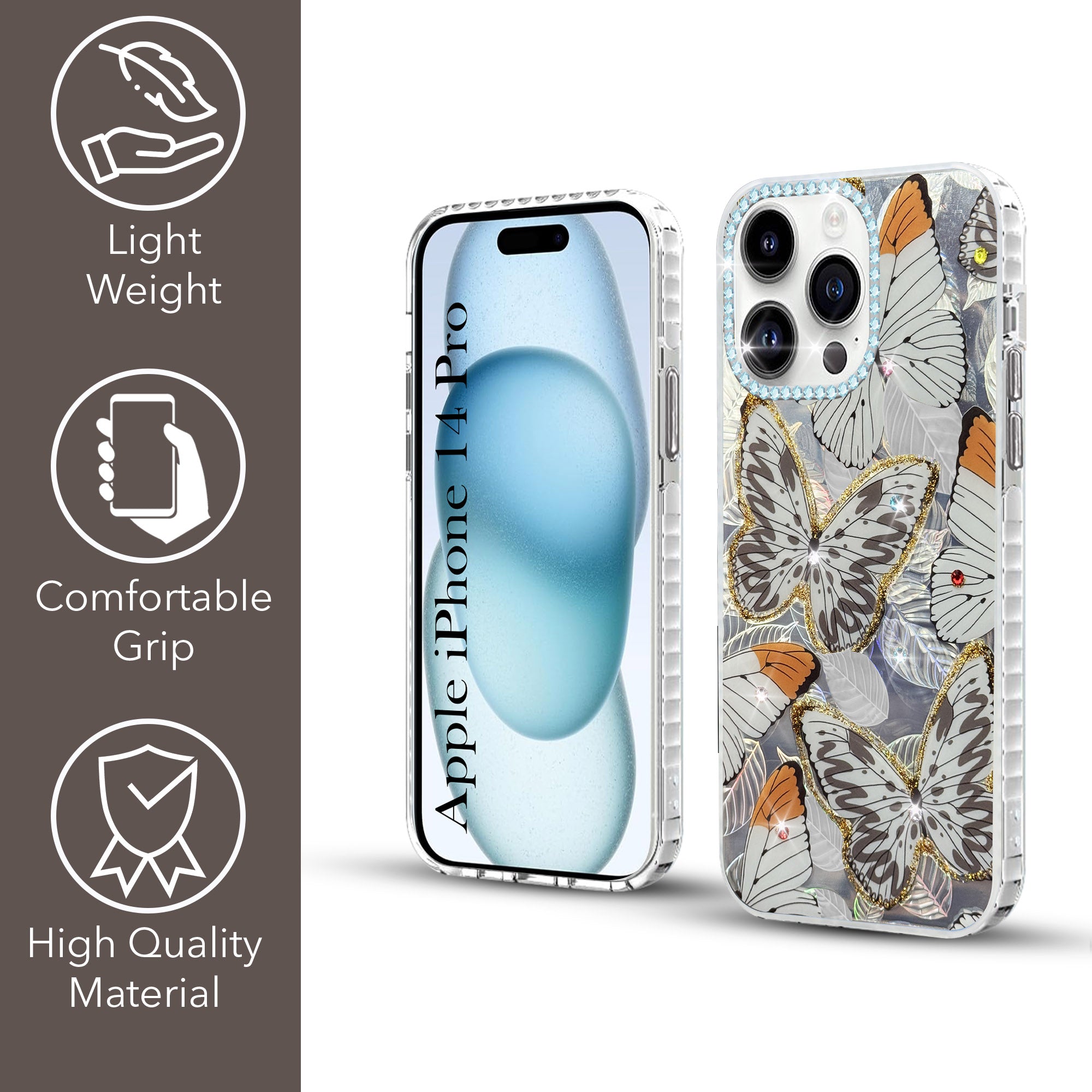 For Apple iPhone 14 Pro Back Cover Case (Luxury Floral Glitter Cute Butterfly | Diamond Studded Camera Bump | Girls & Women Design)
