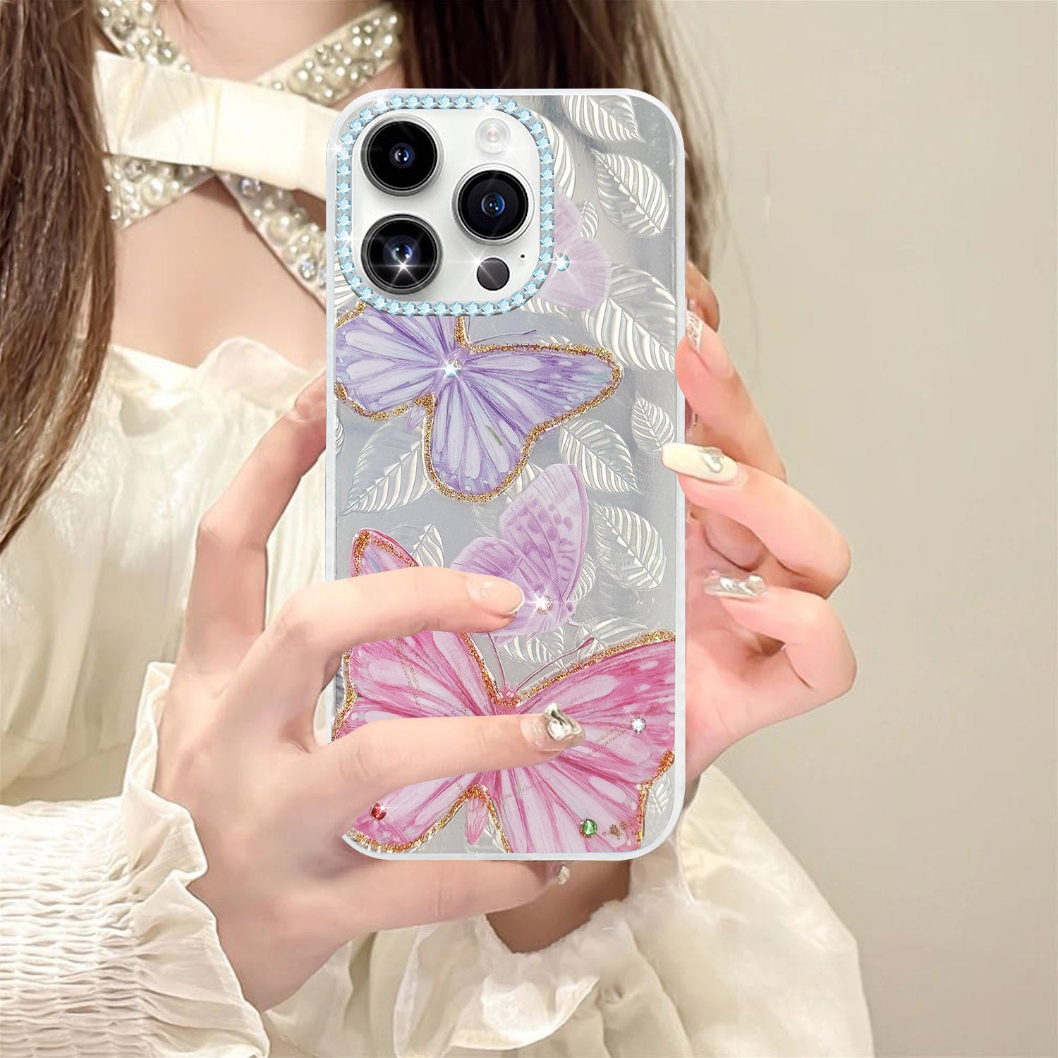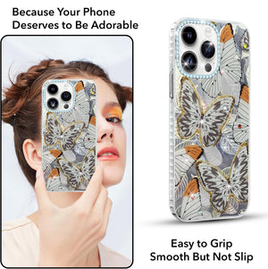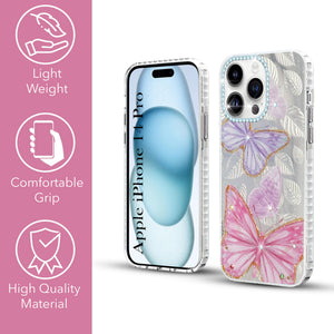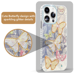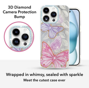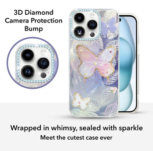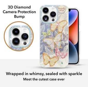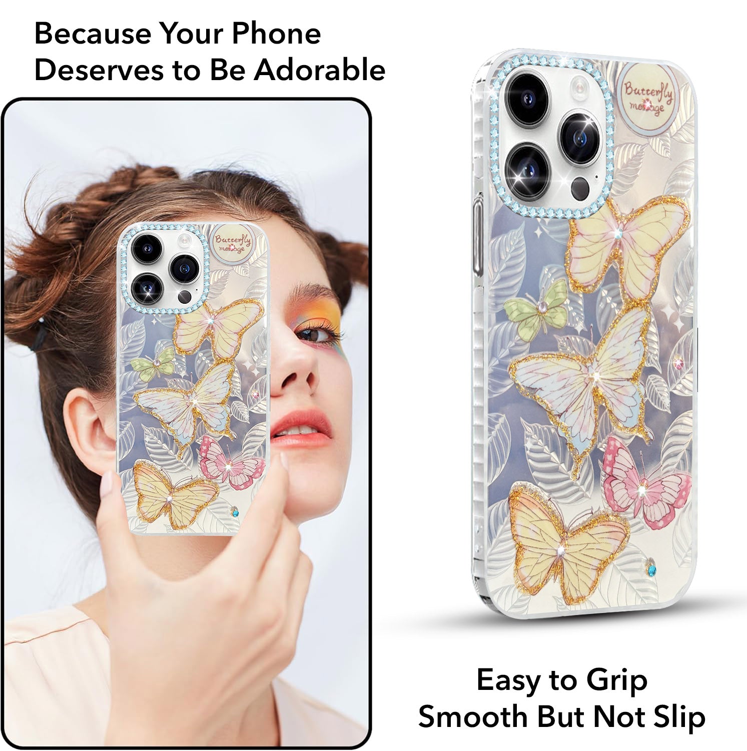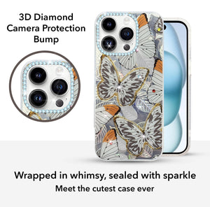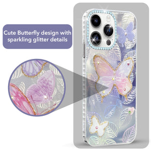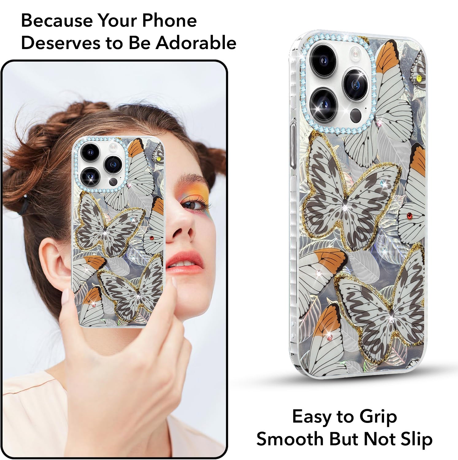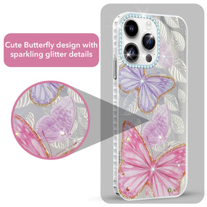 For Apple iPhone 14 Pro Back Cover Case (Luxury Floral Glitter Cute Butterfly | Diamond Studded Camera Bump | Girls & Women Design)
