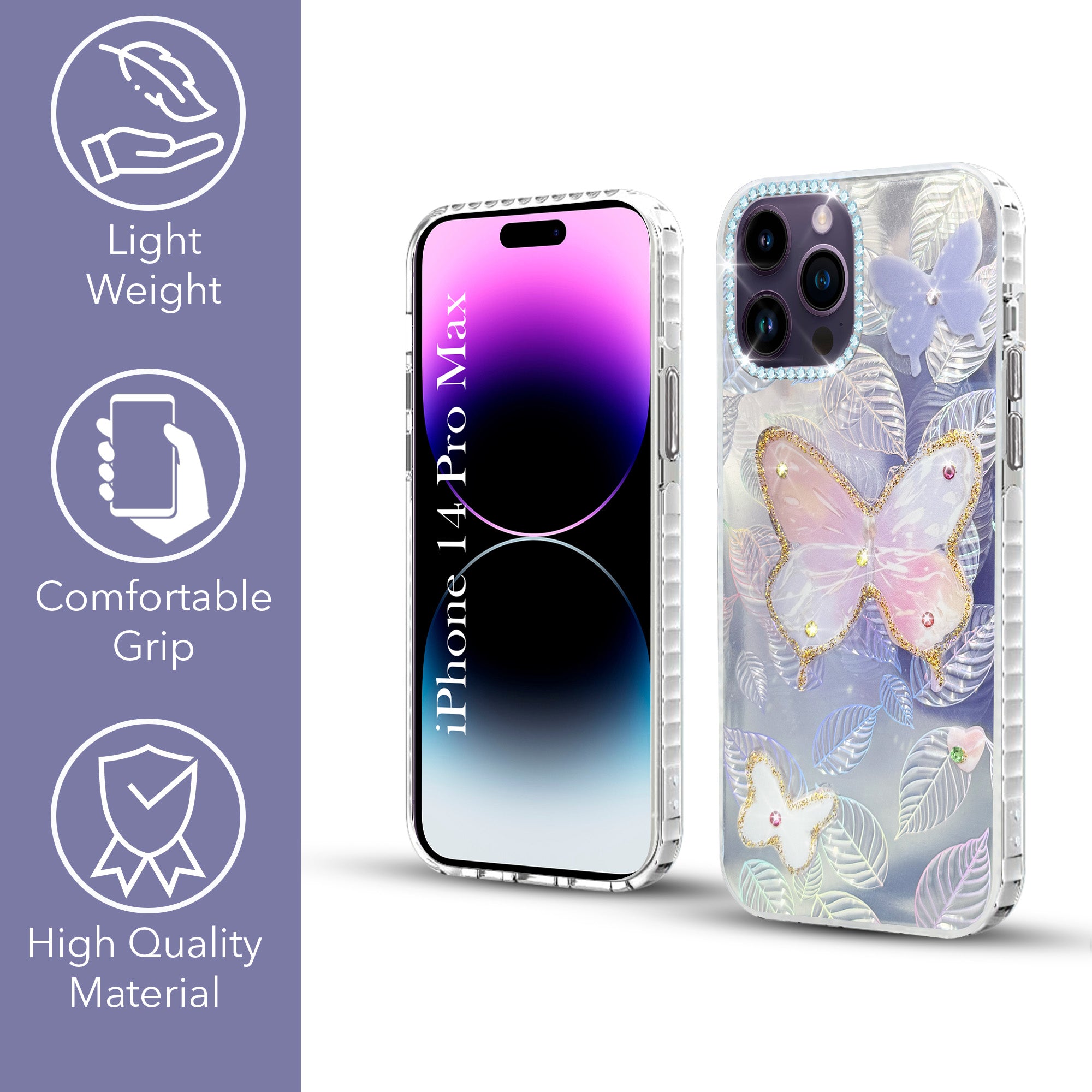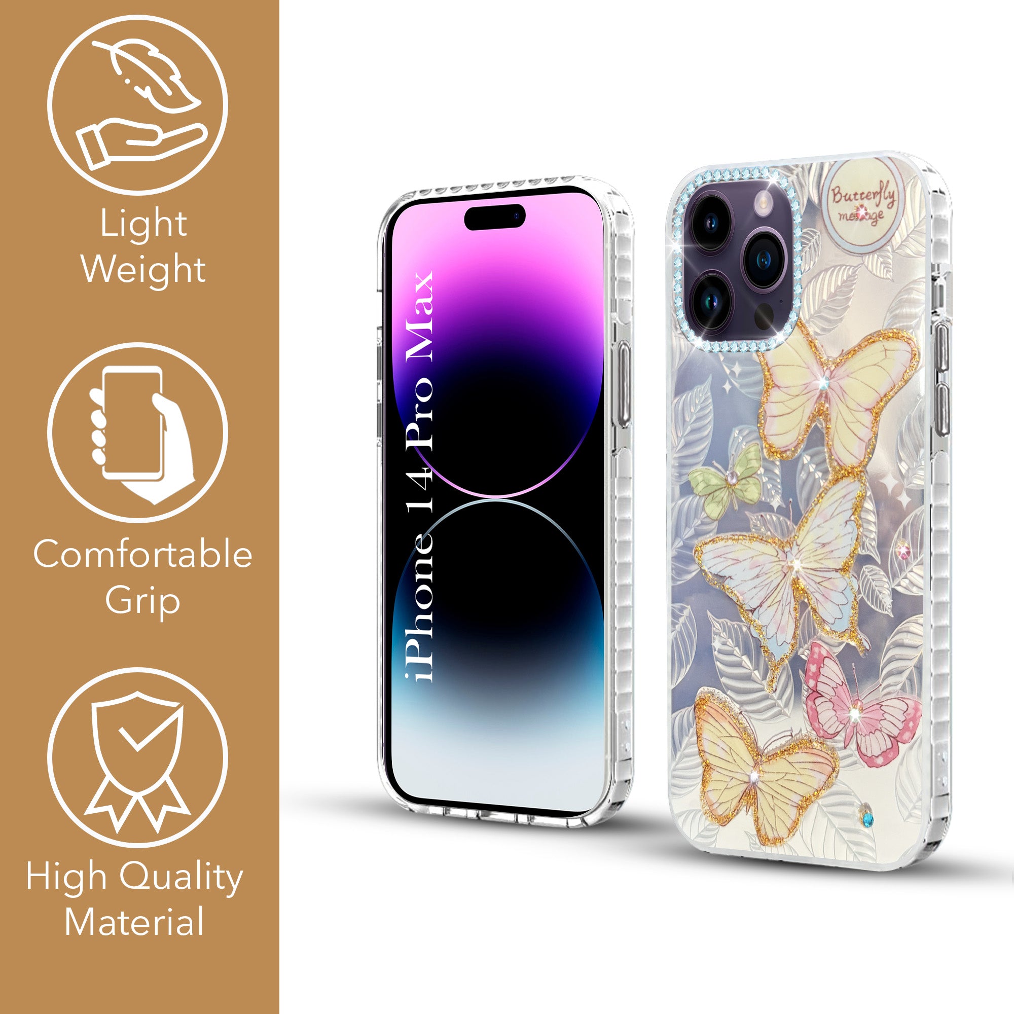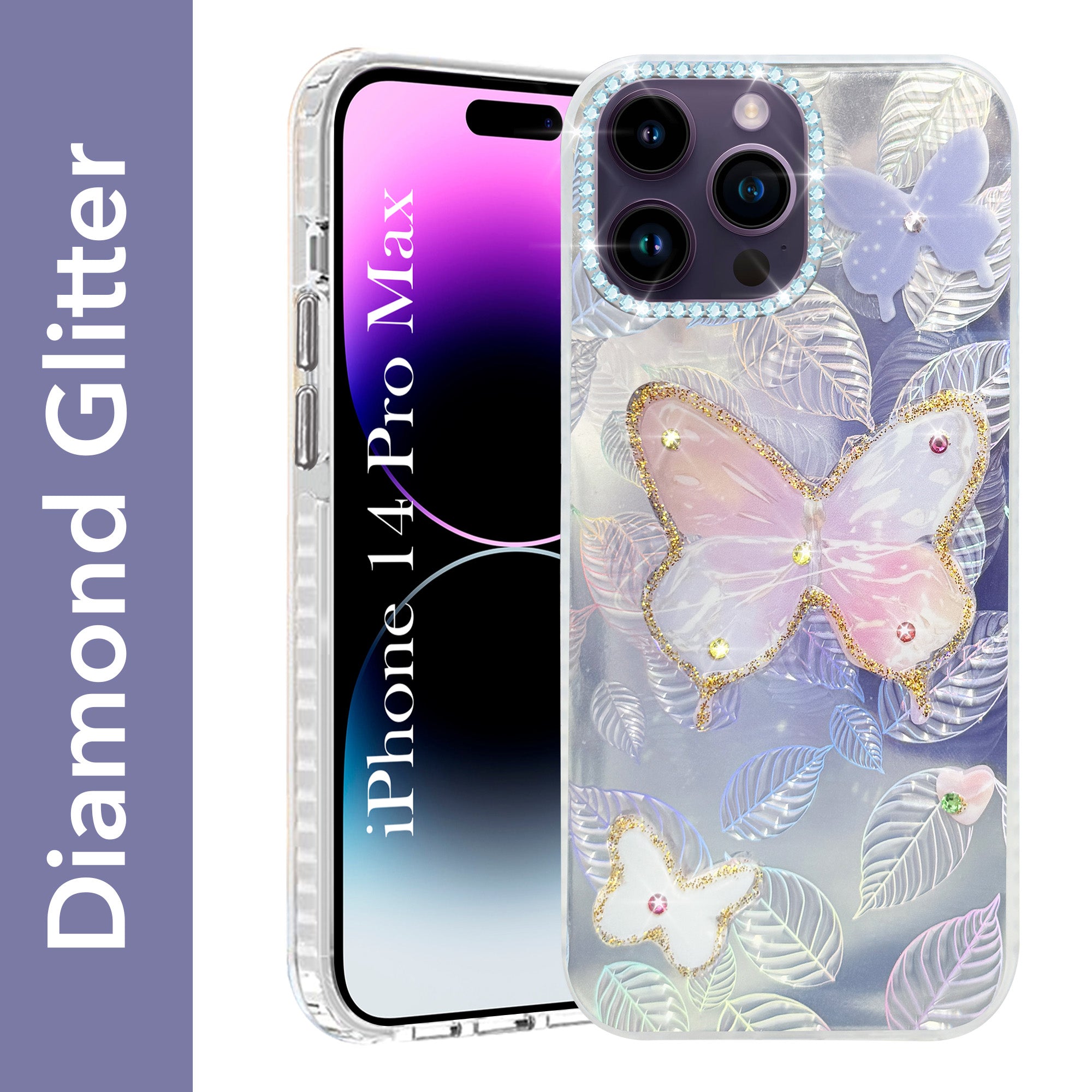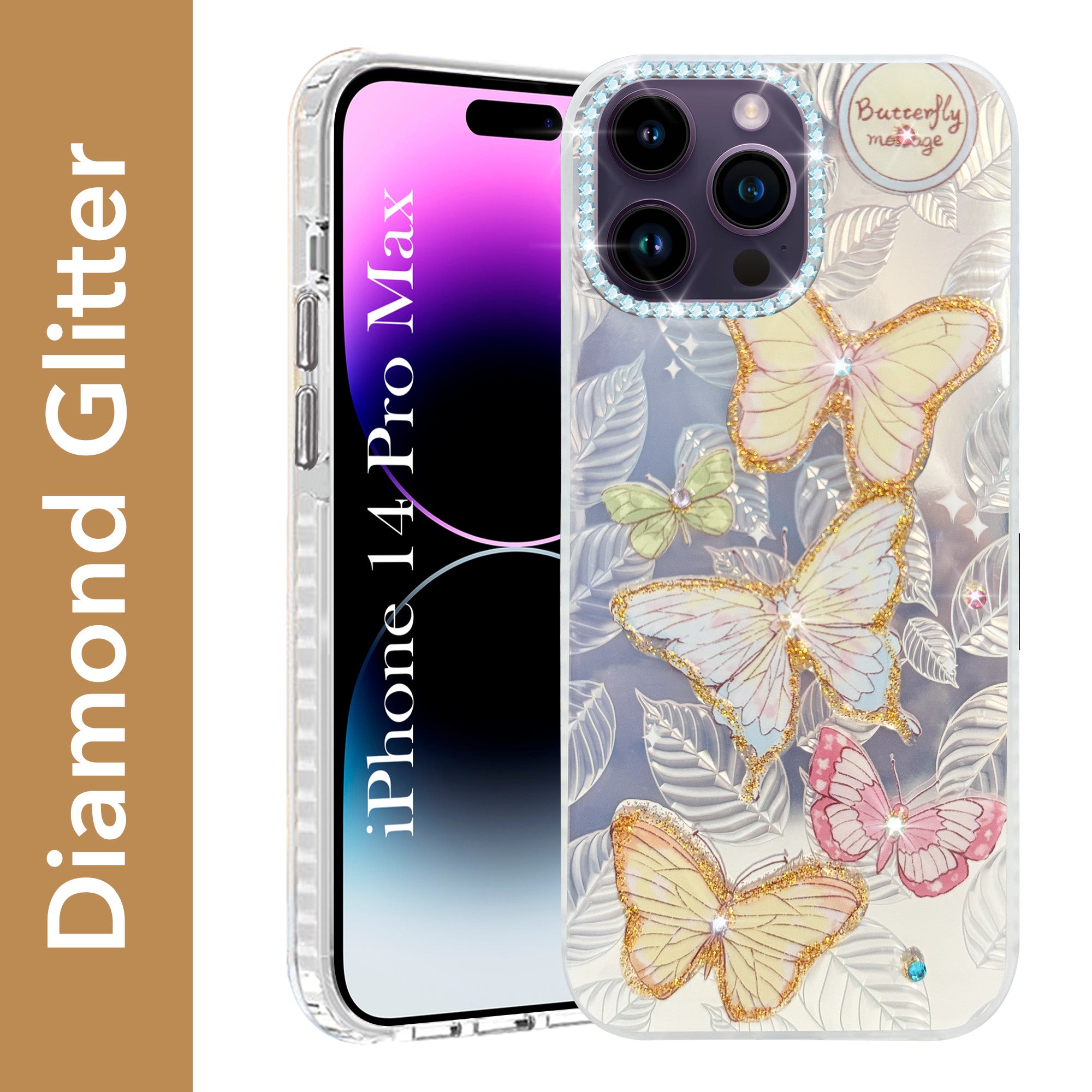 For Apple iPhone 14 Pro Max Back Cover Case (Luxury Floral Glitter Cute Butterfly | Diamond Studded Camera Bump | Girls & Women Design)
