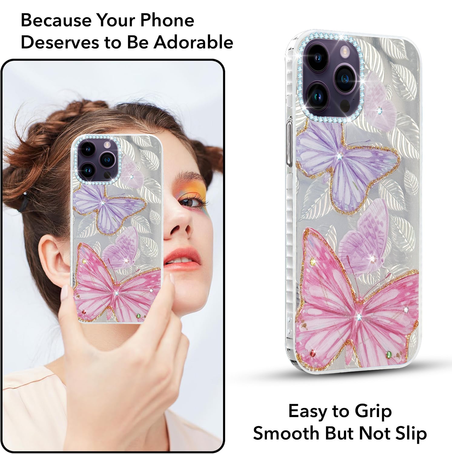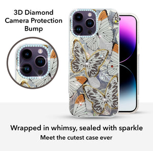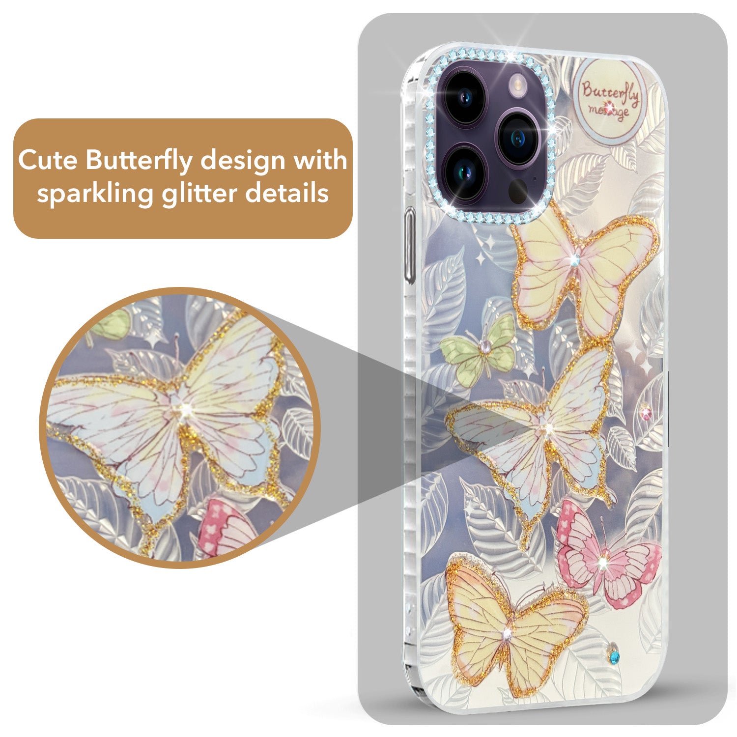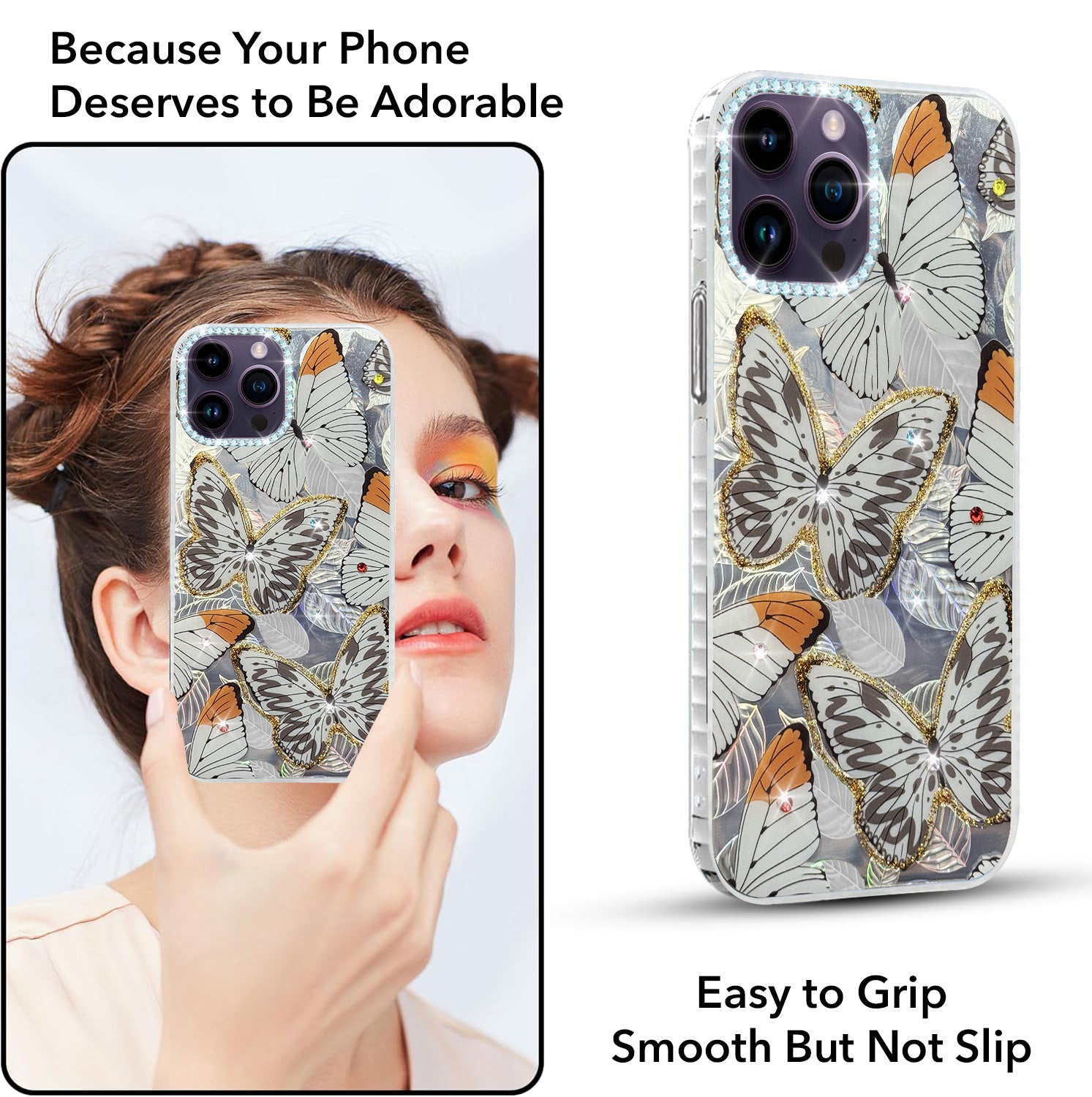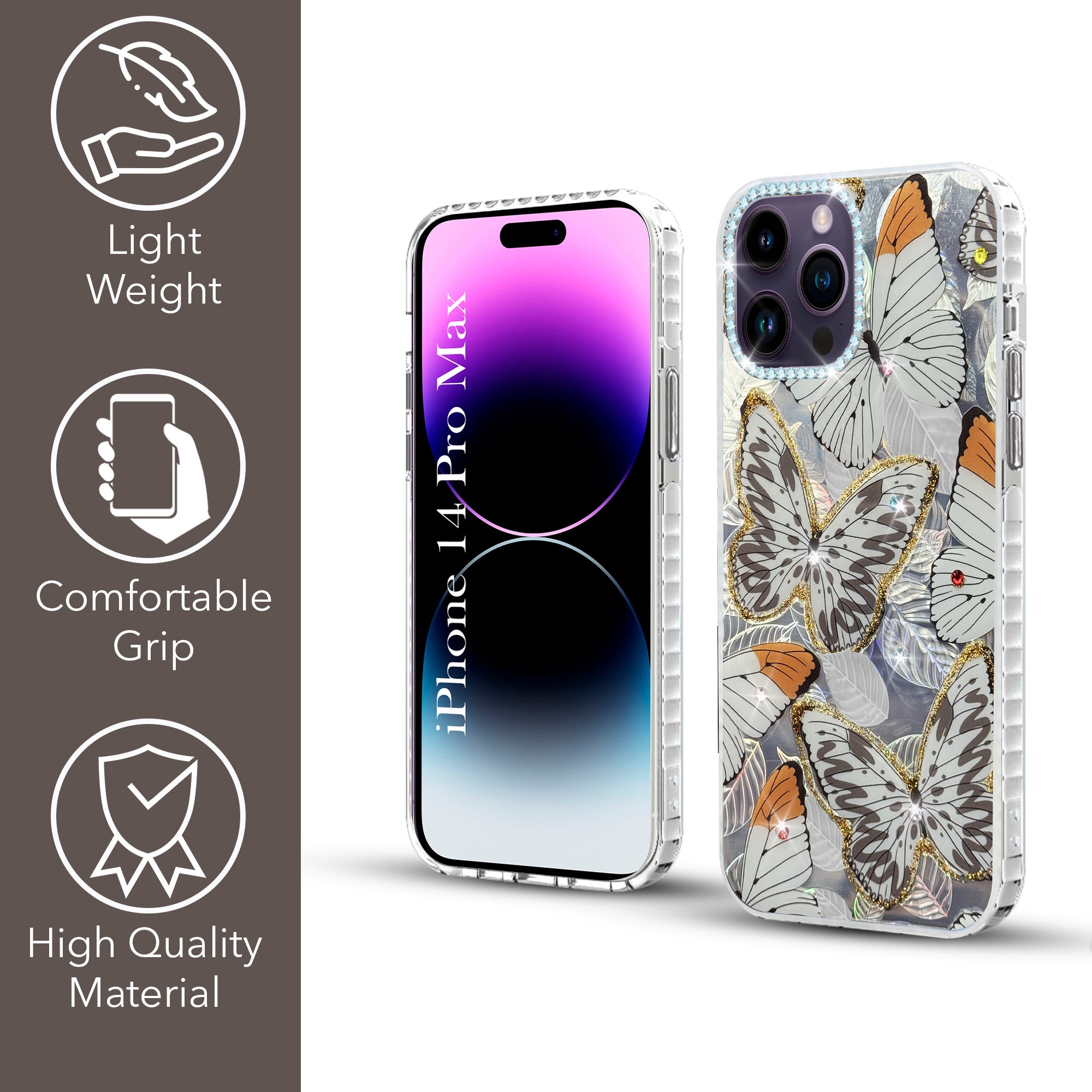 For Apple iPhone 14 Pro Max Back Cover Case (Luxury Floral Glitter Cute Butterfly | Diamond Studded Camera Bump | Girls & Women Design)