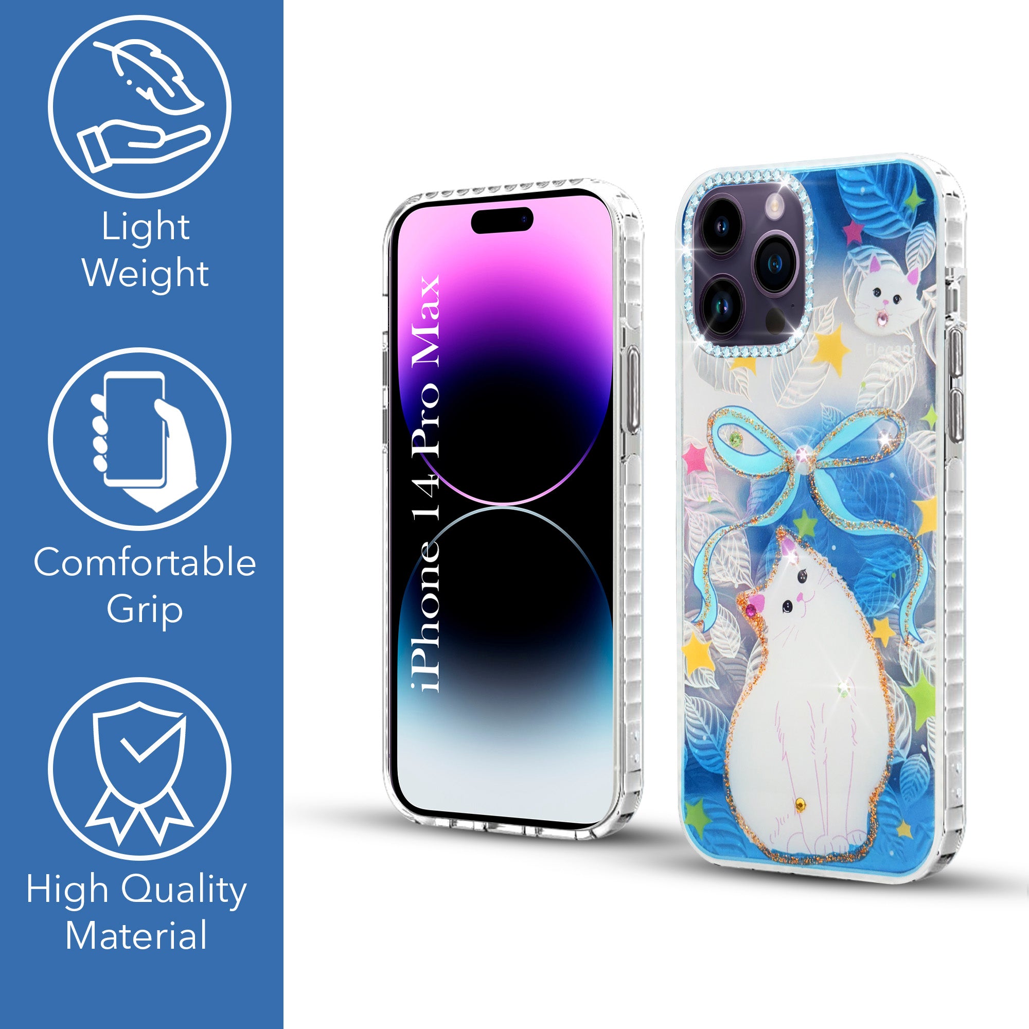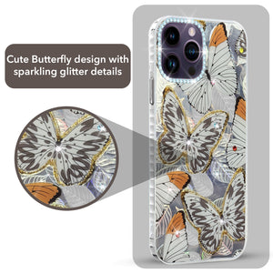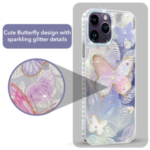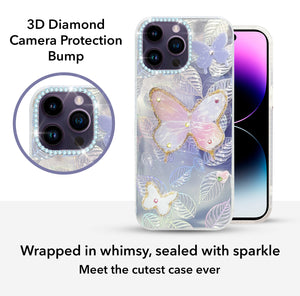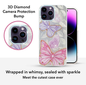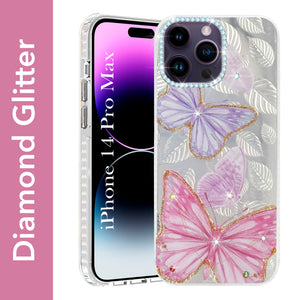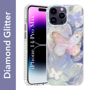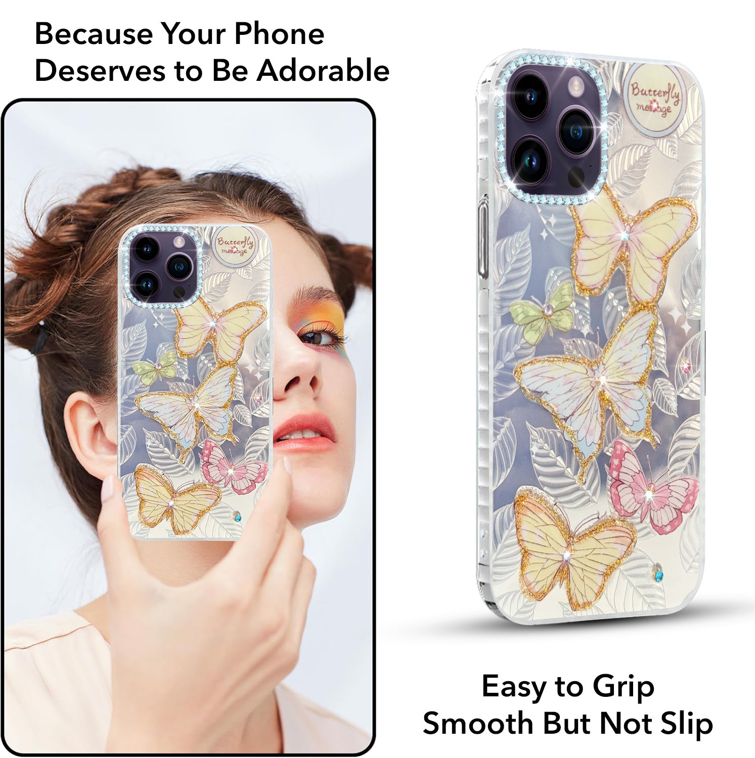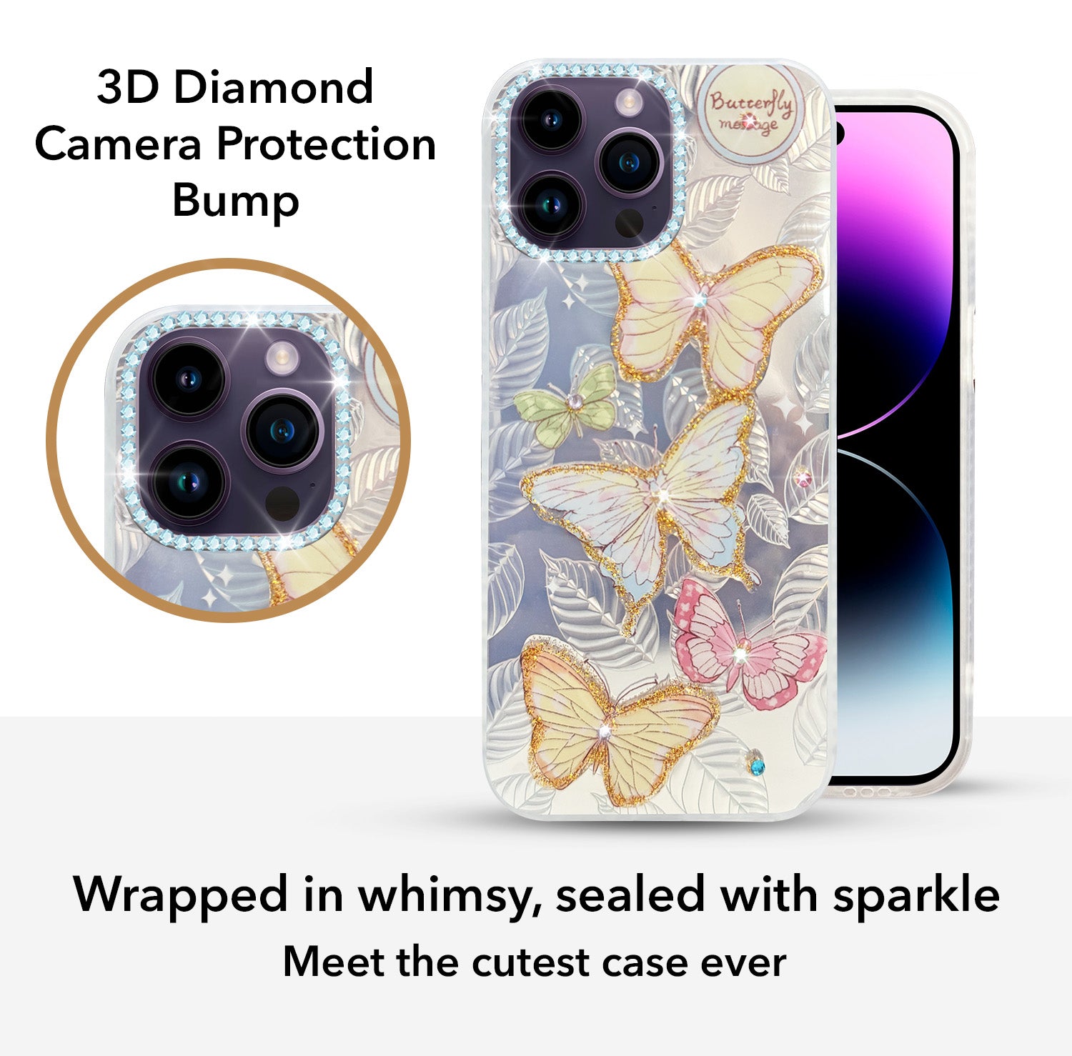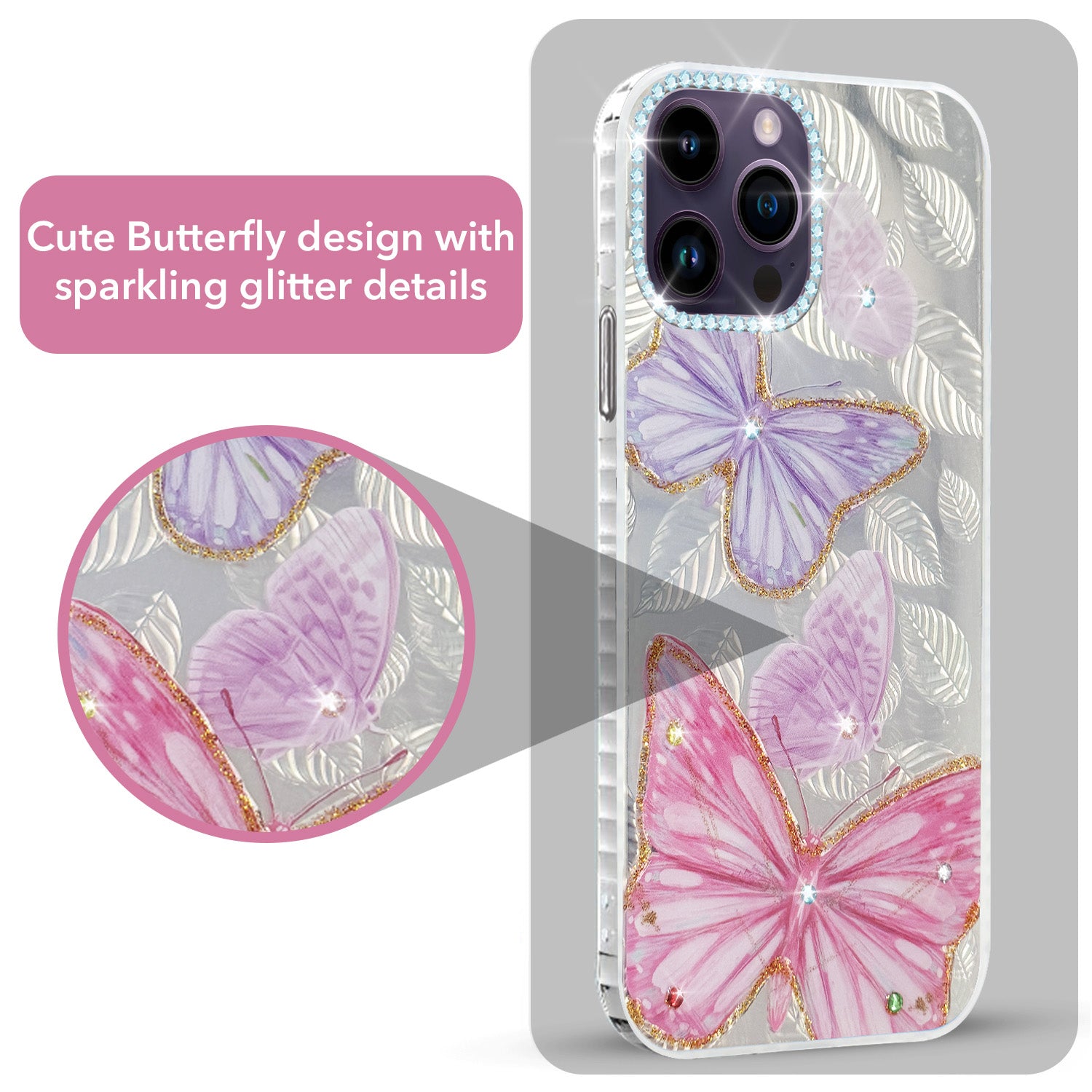 For Apple iPhone 14 Pro Max Back Cover Case (Luxury Floral Glitter Cute Butterfly | Diamond Studded Camera Bump | Girls & Women Design)