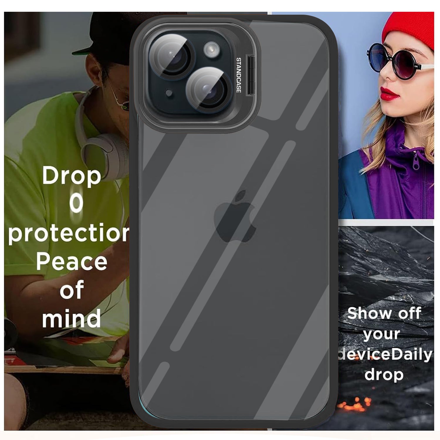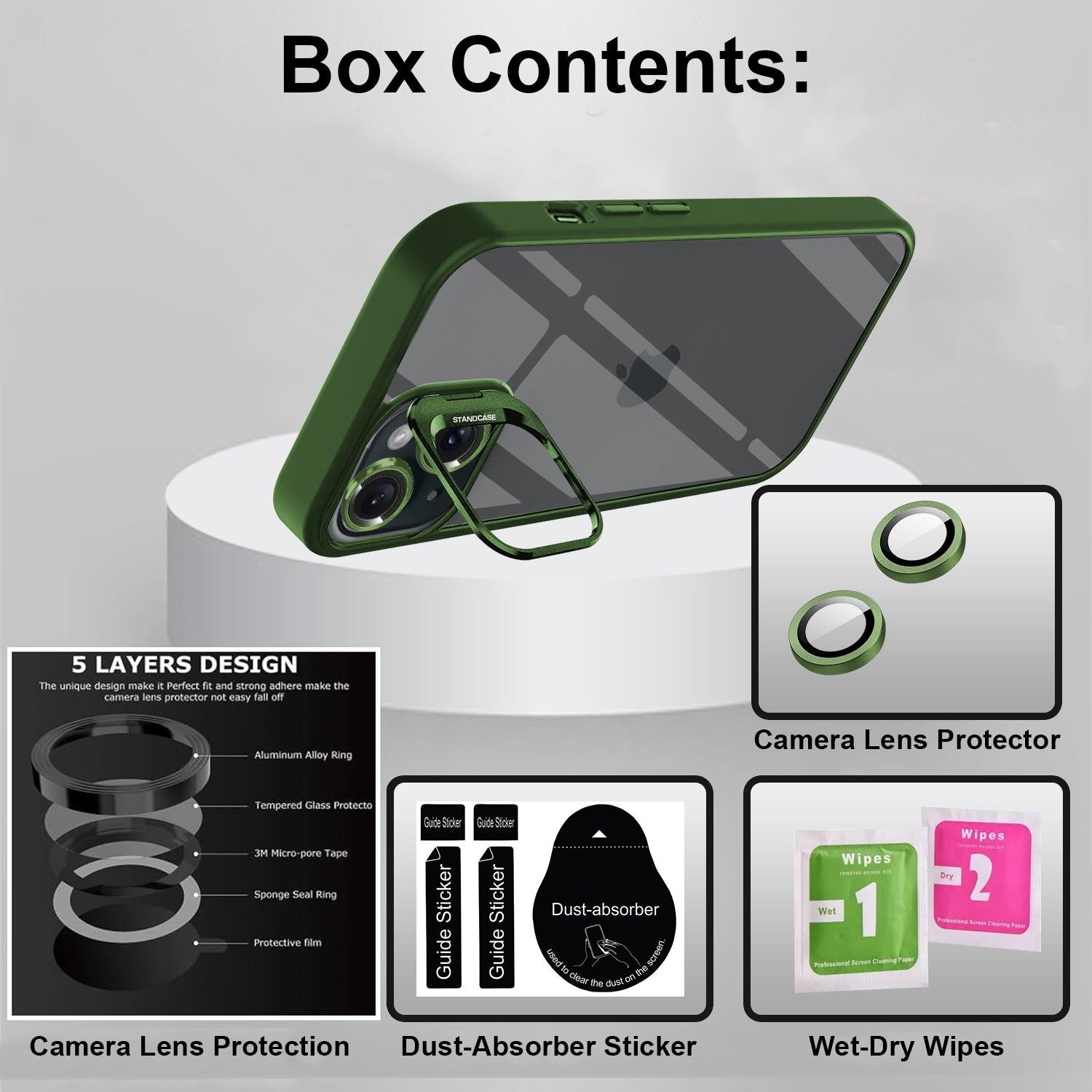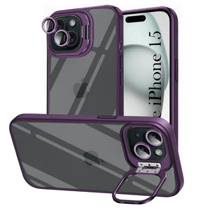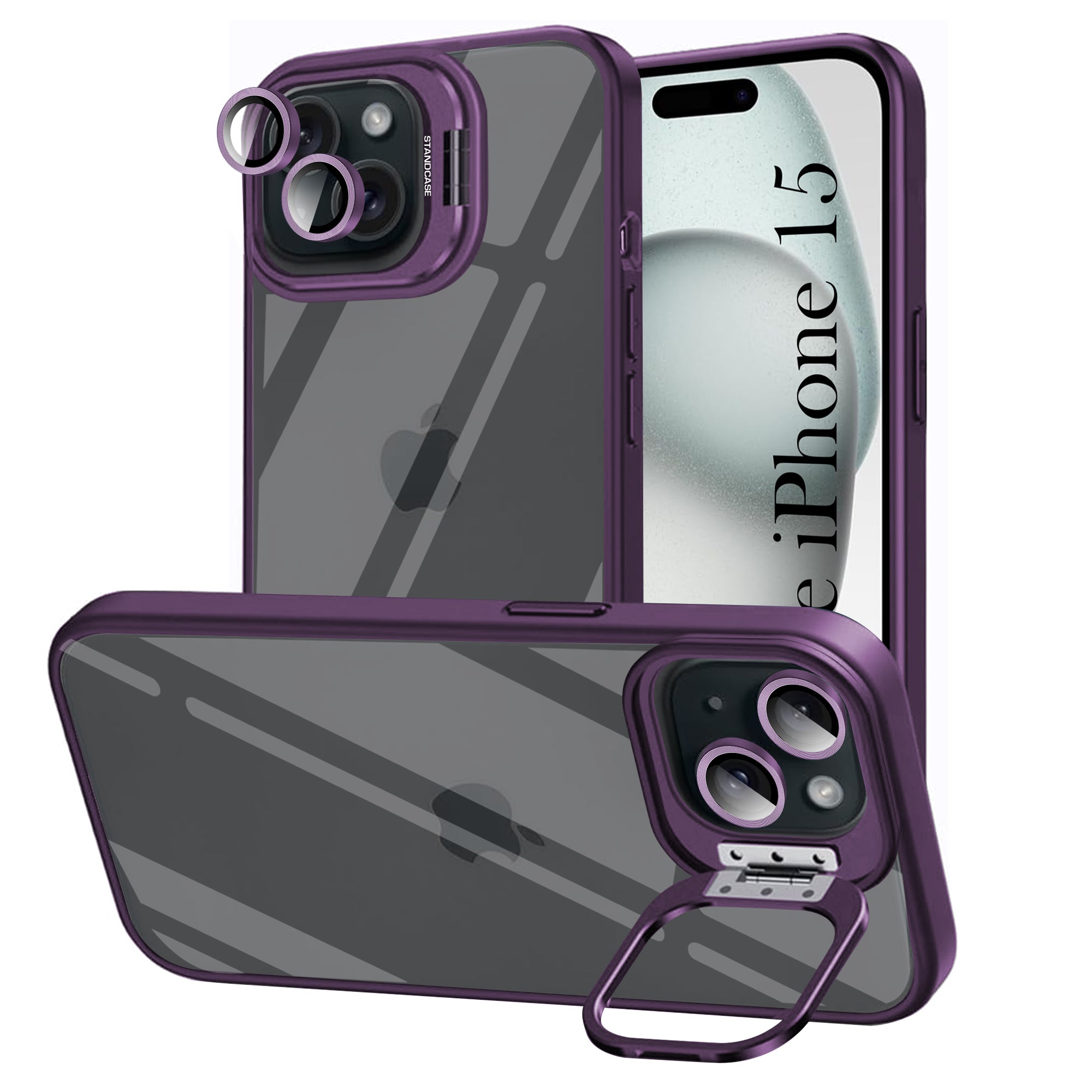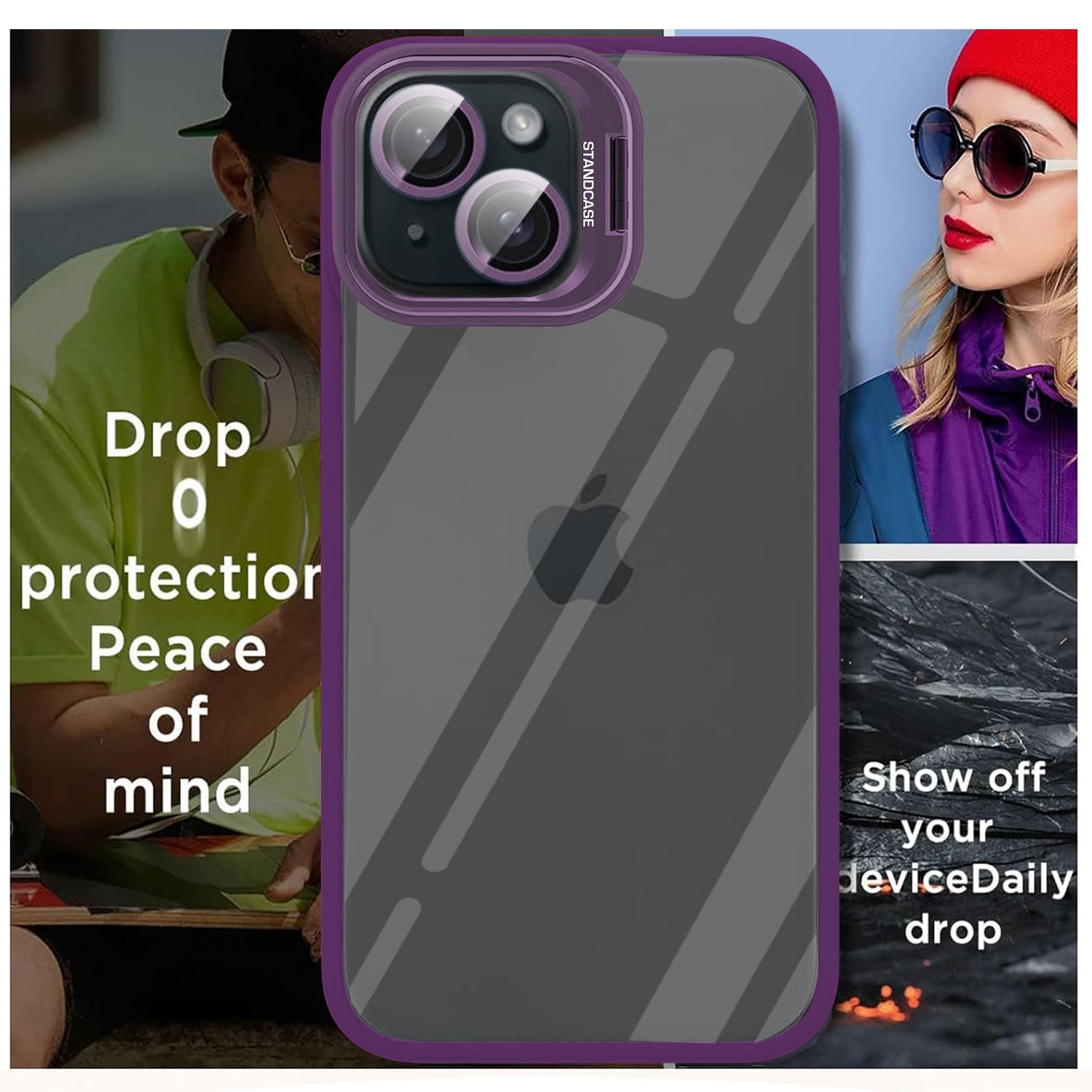 For Apple iPhone 15 Back Cover Case (Camera Lens Glass | Metal Stand Holder | Shockproof Hybrid | Anti Yellow |)