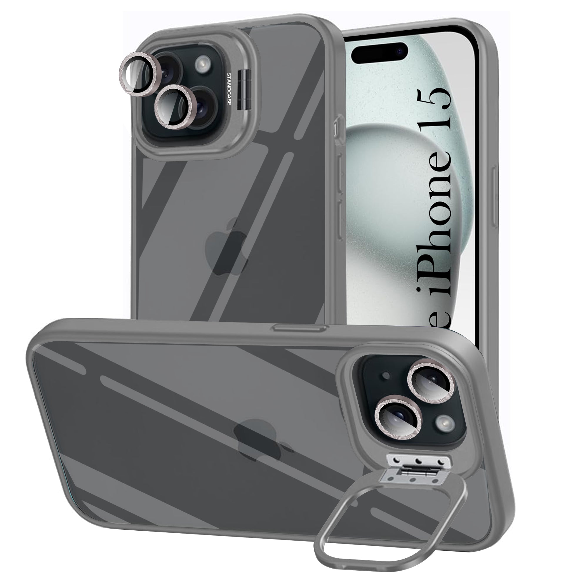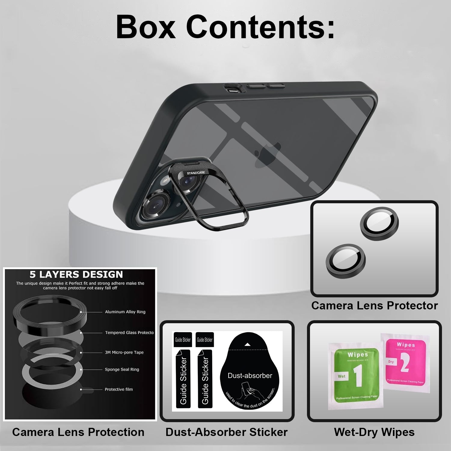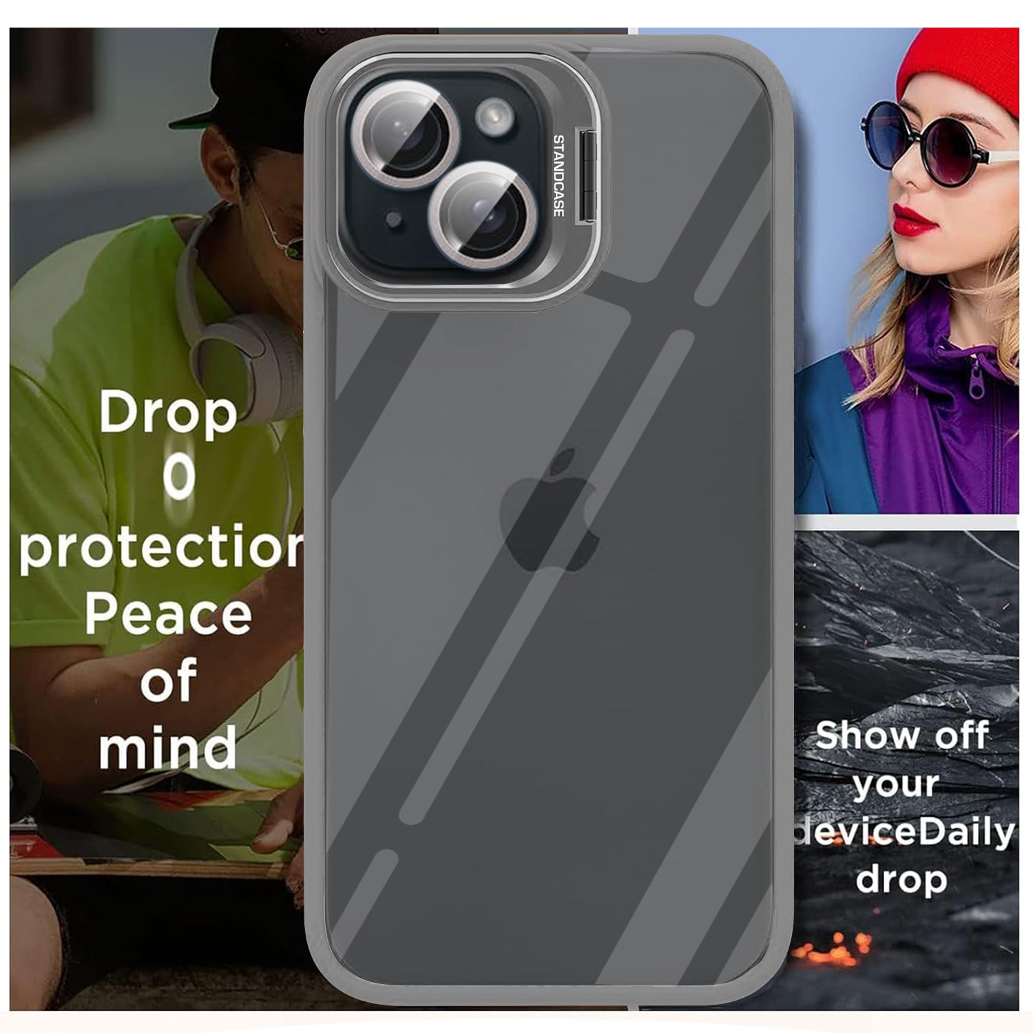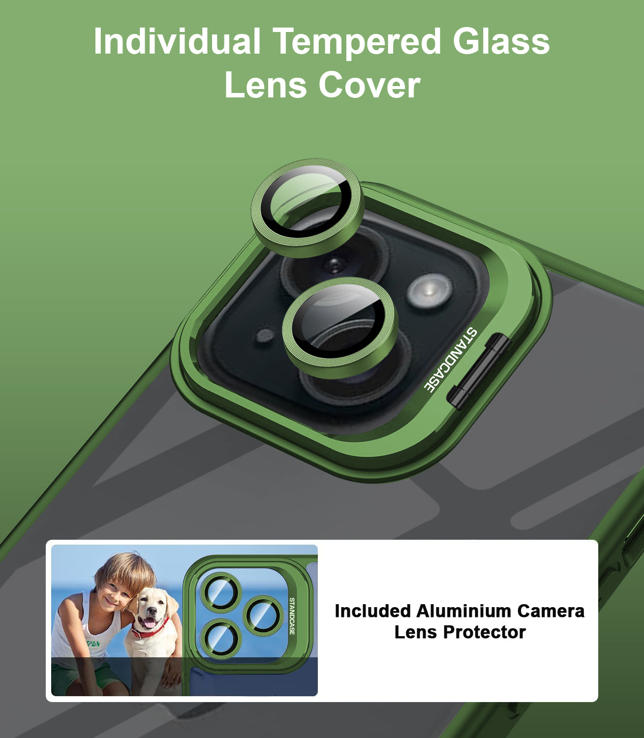 For Apple iPhone 15 Back Cover Case (Camera Lens Glass | Metal Stand Holder | Shockproof Hybrid | Anti Yellow |)