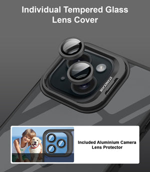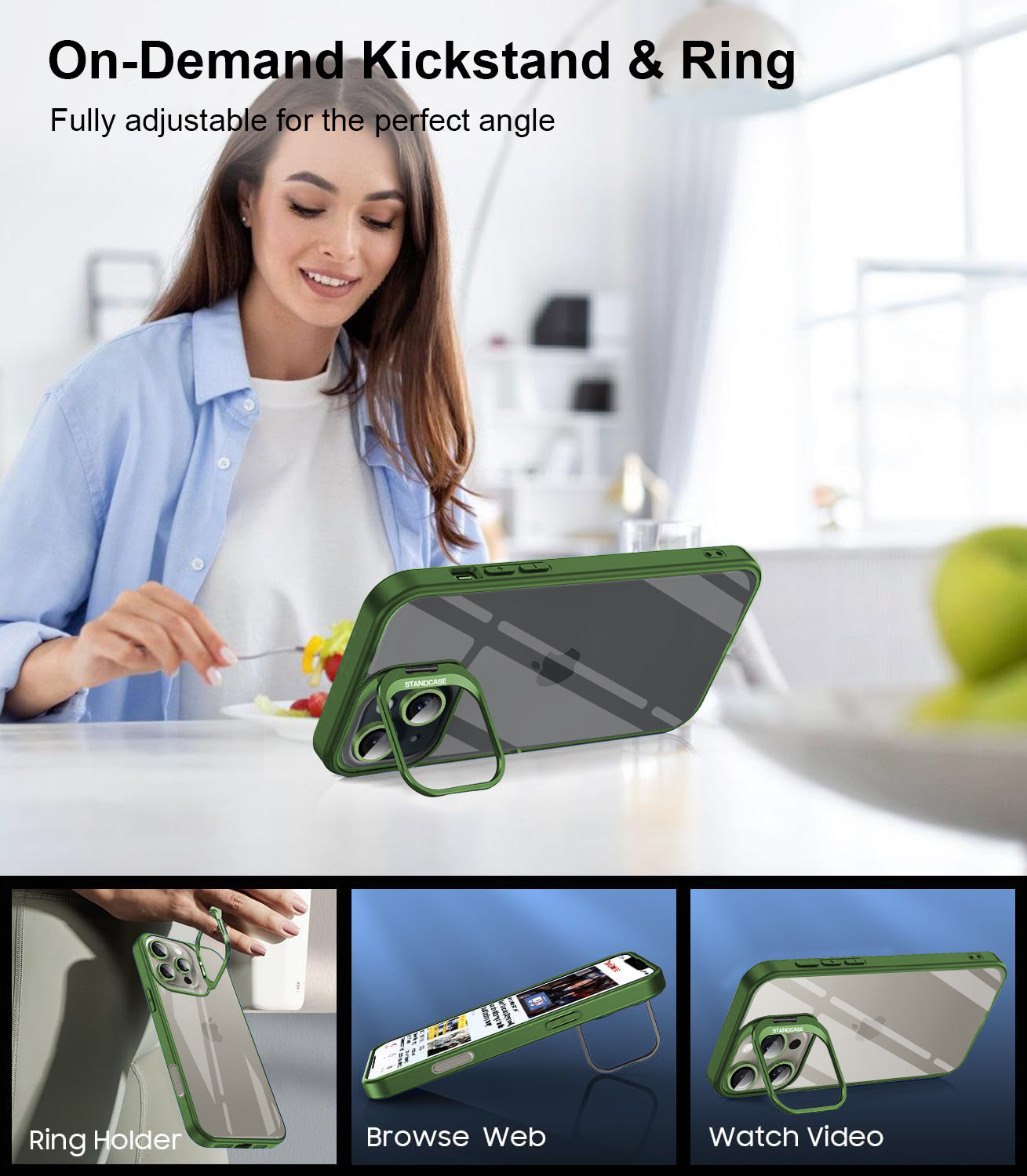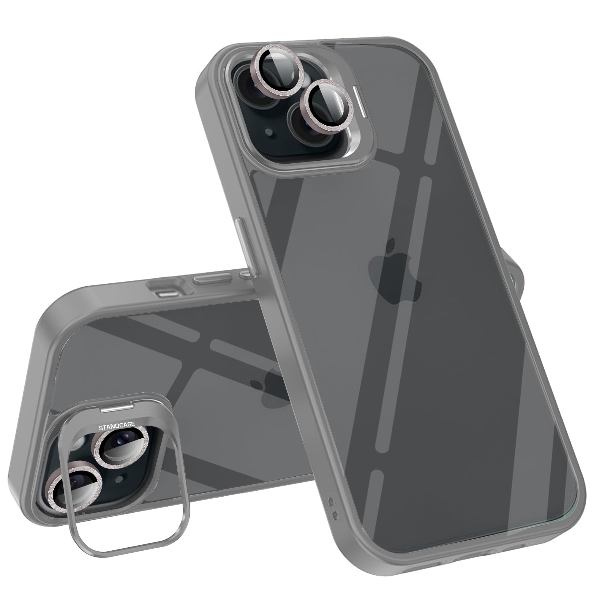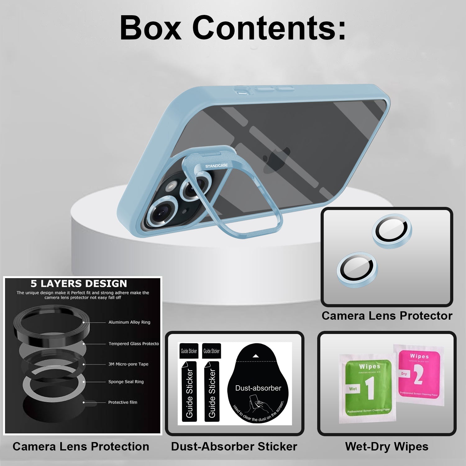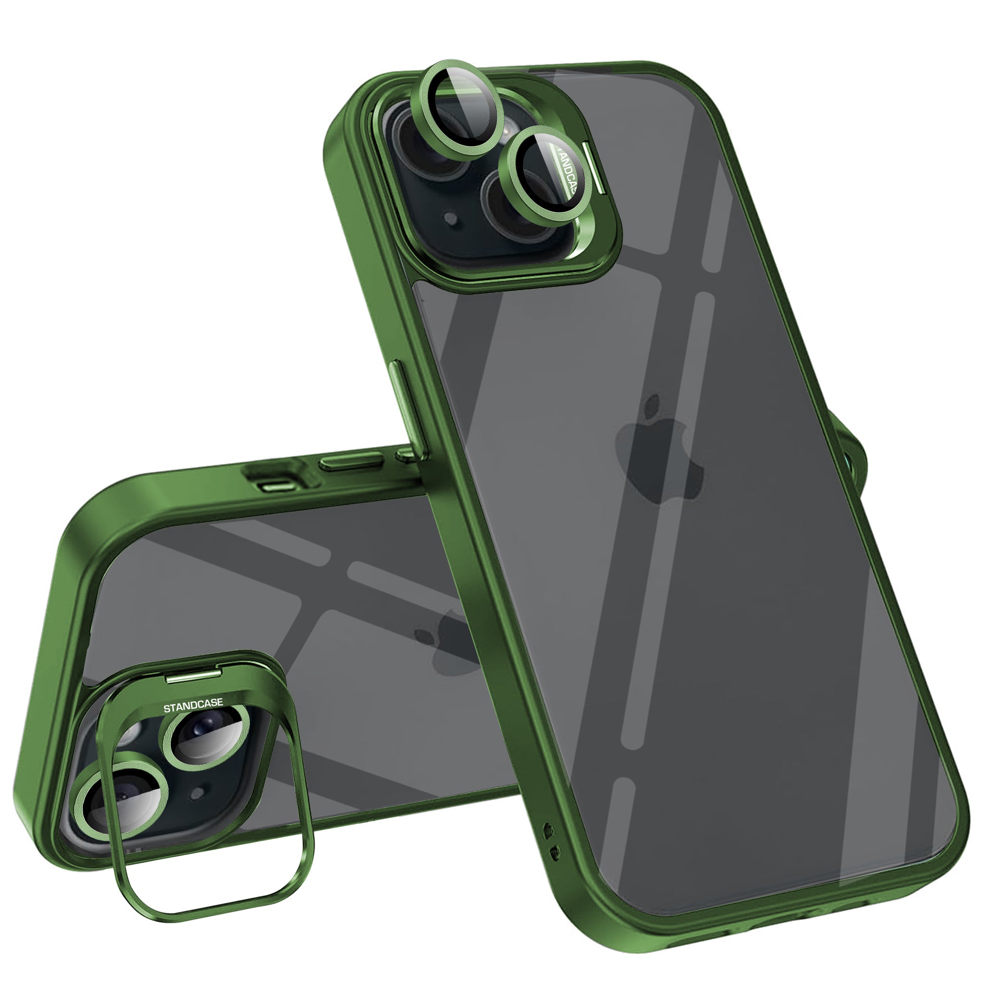 For Apple iPhone 15 Back Cover Case (Camera Lens Glass | Metal Stand Holder | Shockproof Hybrid | Anti Yellow |)