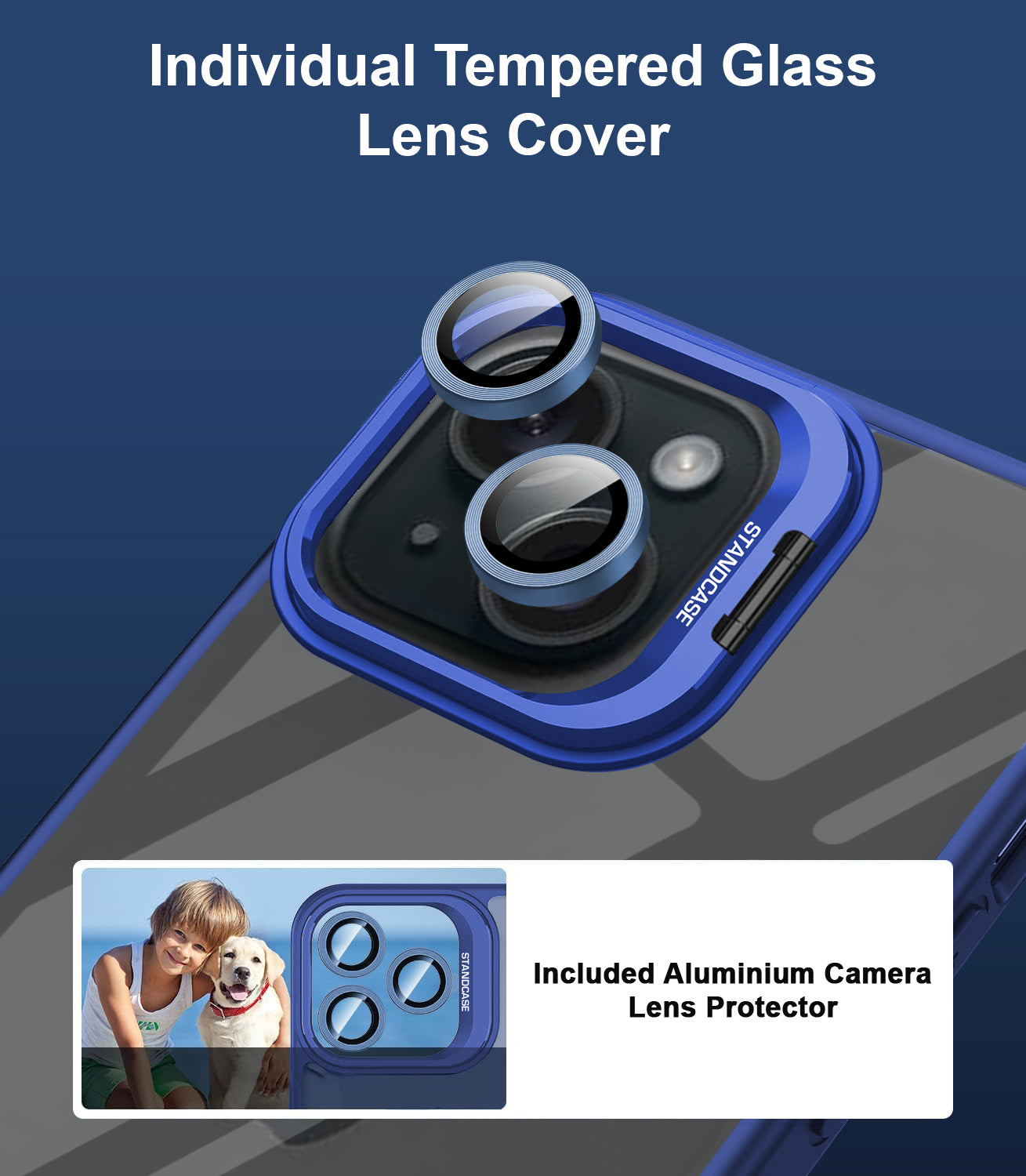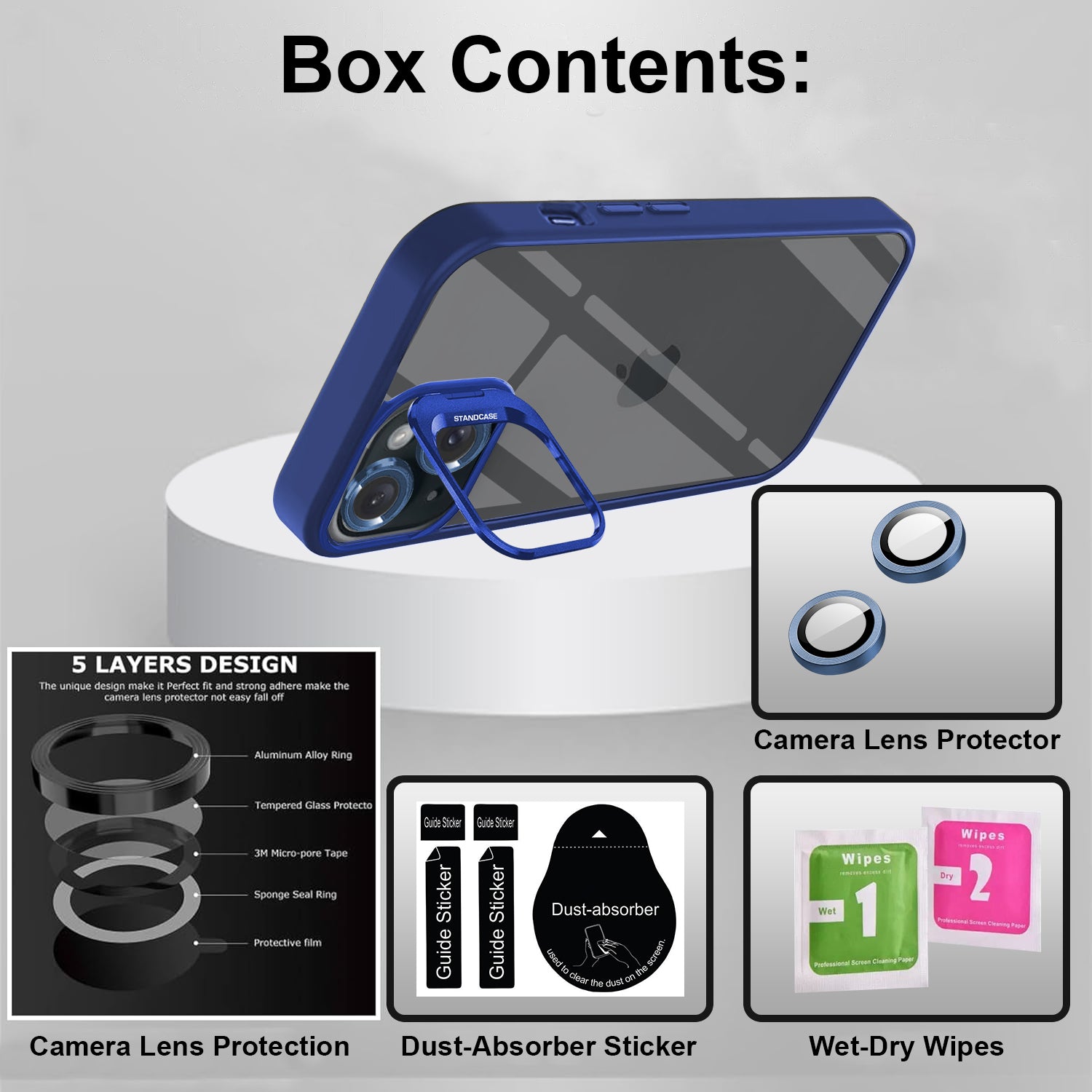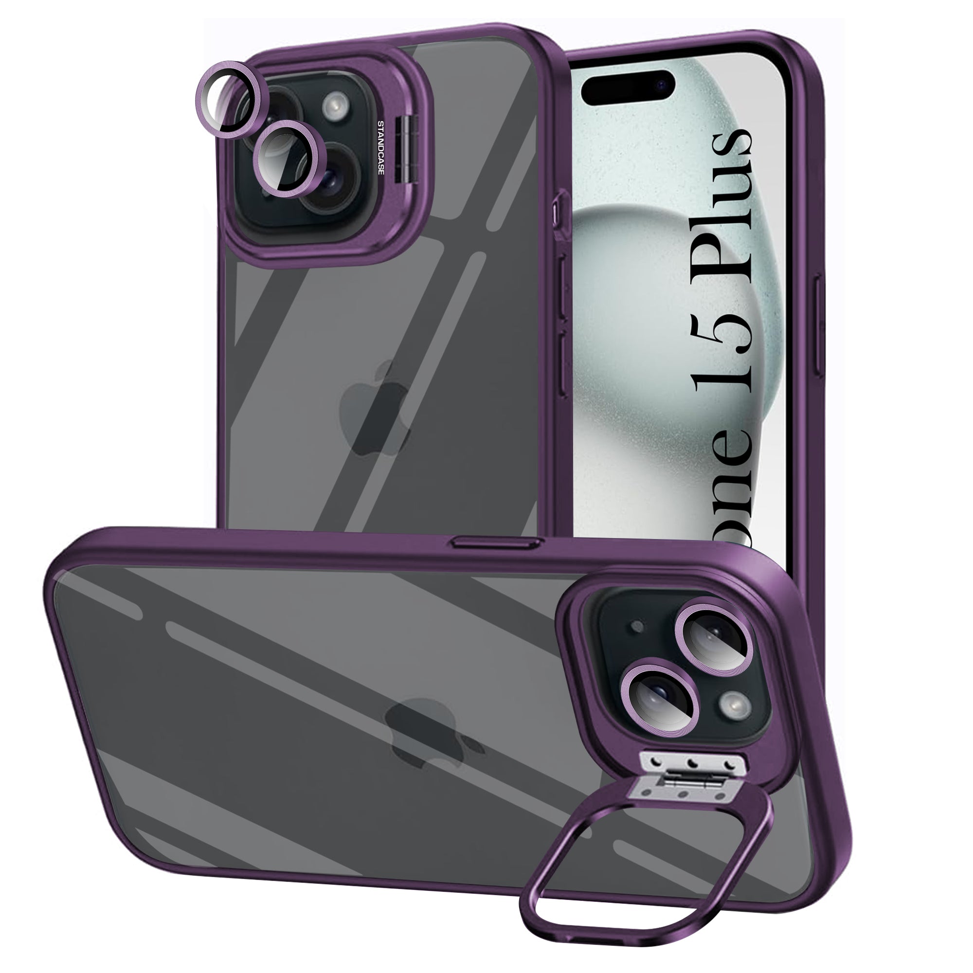 For Apple iPhone 15 Plus Back Cover Case (Camera Lens Glass | Metal Stand Holder | Shockproof Hybrid | Anti Yellow |)