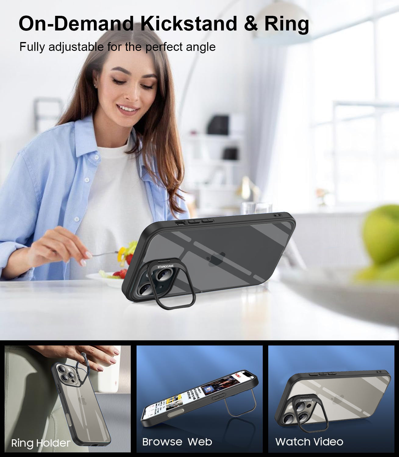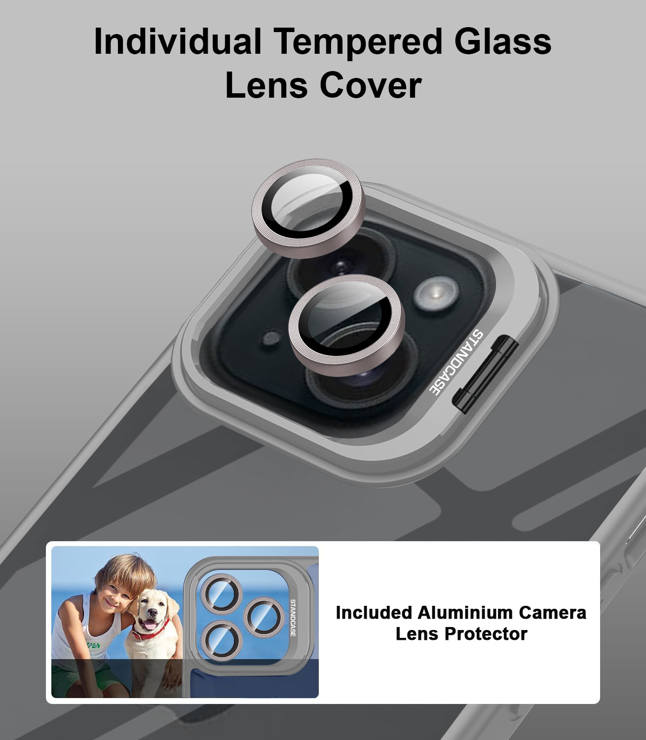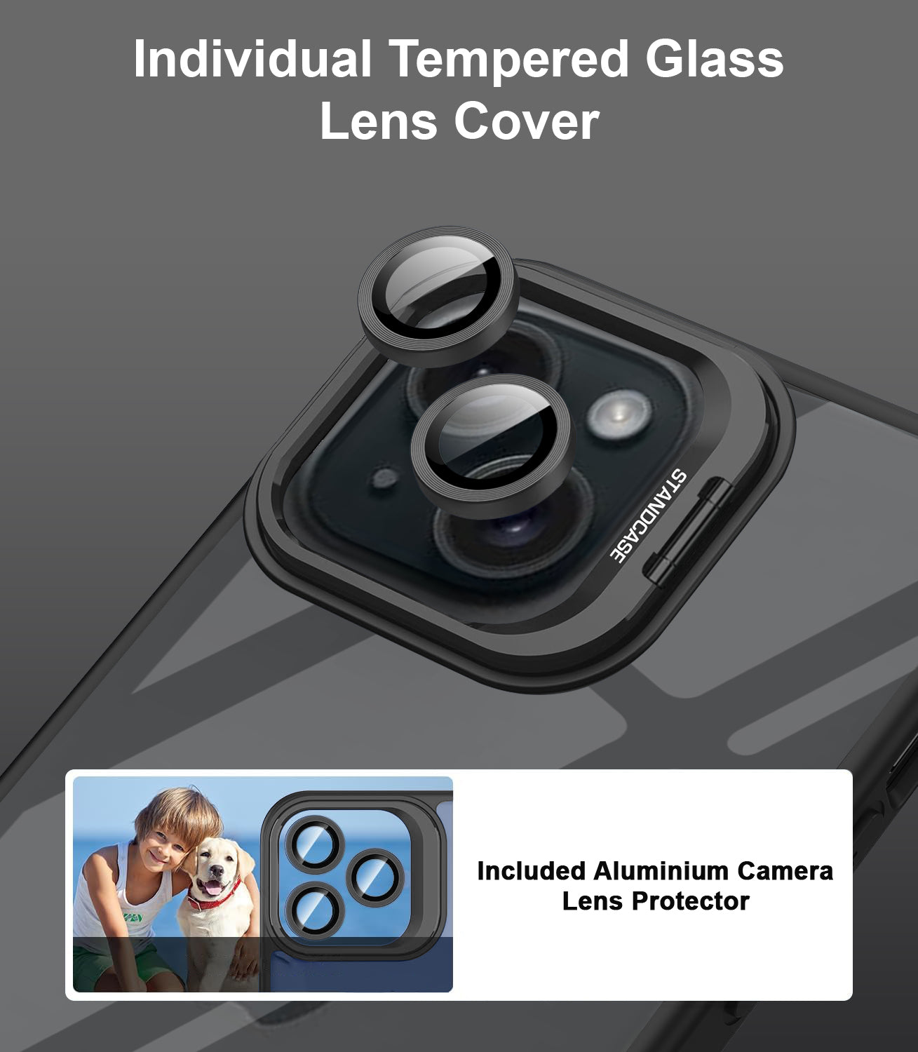 For Apple iPhone 15 Plus Back Cover Case (Camera Lens Glass | Metal Stand Holder | Shockproof Hybrid | Anti Yellow |)