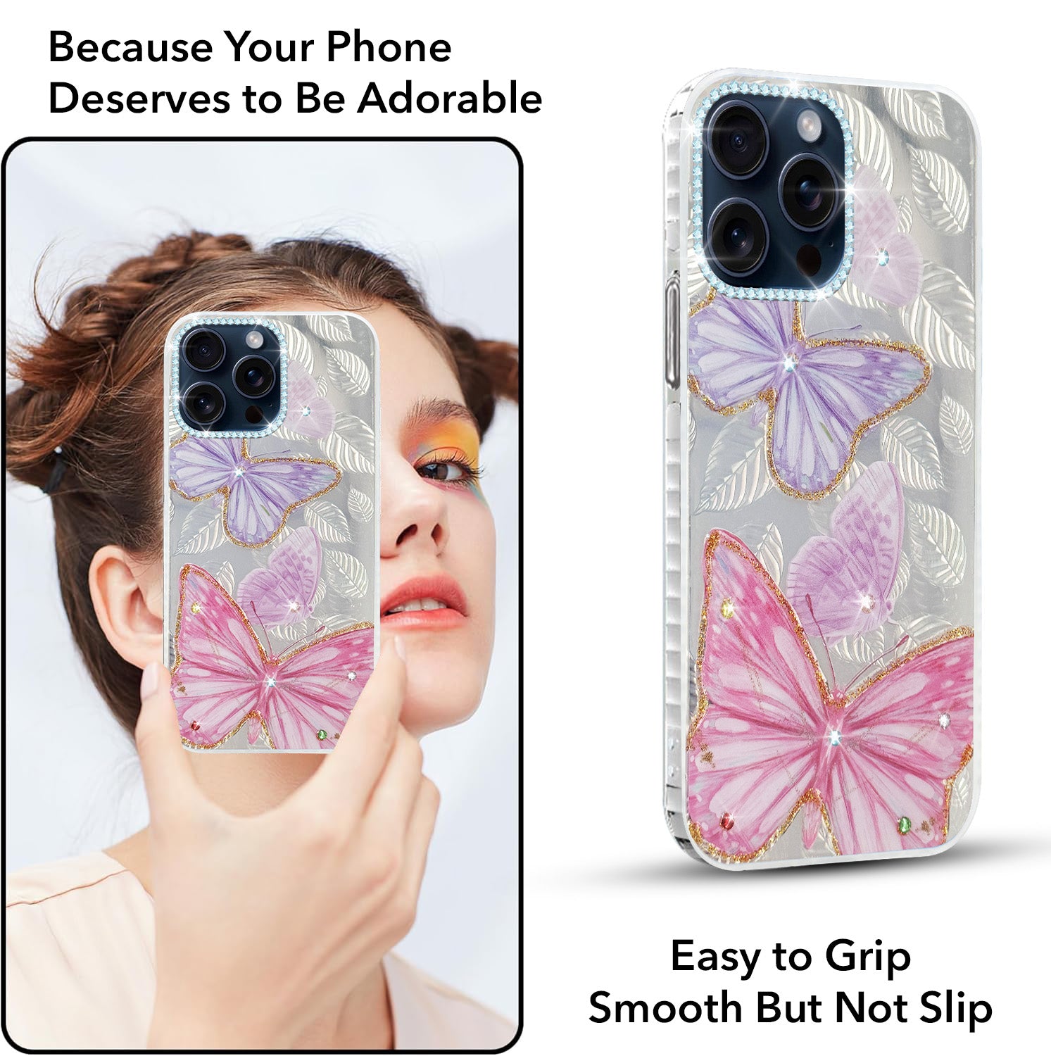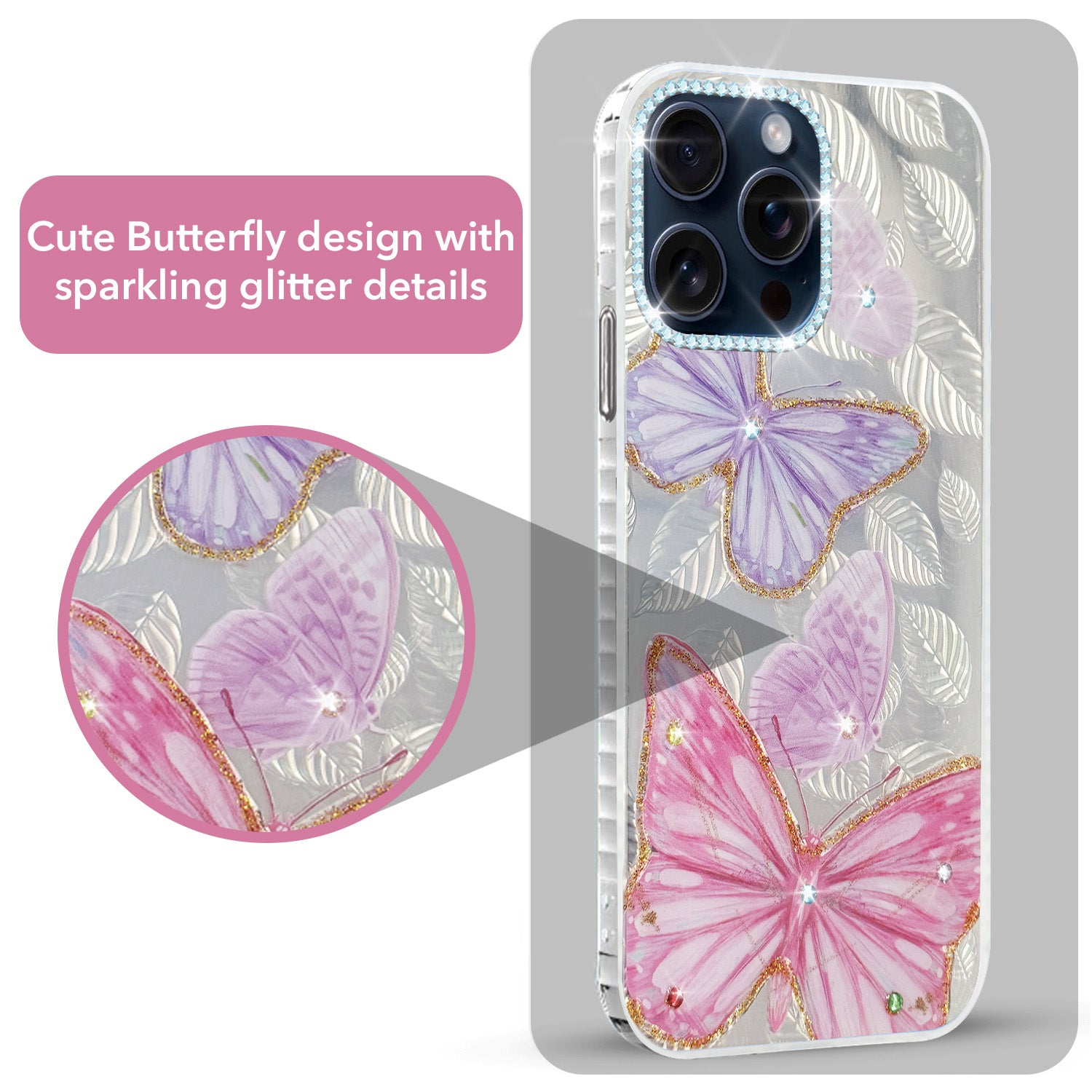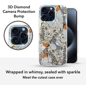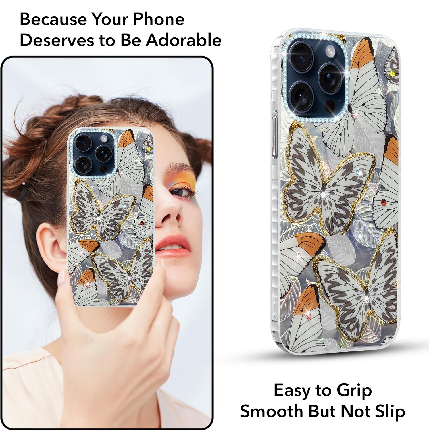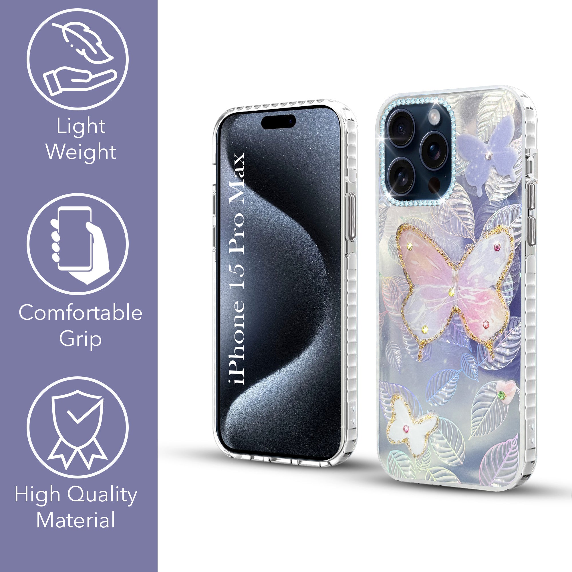 For Apple iPhone 15 Pro Max Back Cover Case (Luxury Floral Glitter Cute Butterfly | Diamond Studded Camera Bump | Girls & Women Design)