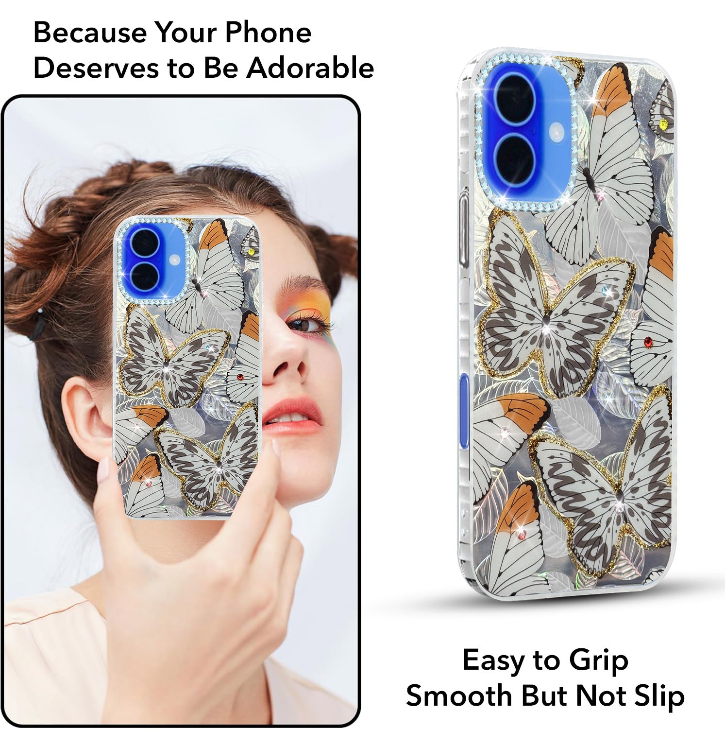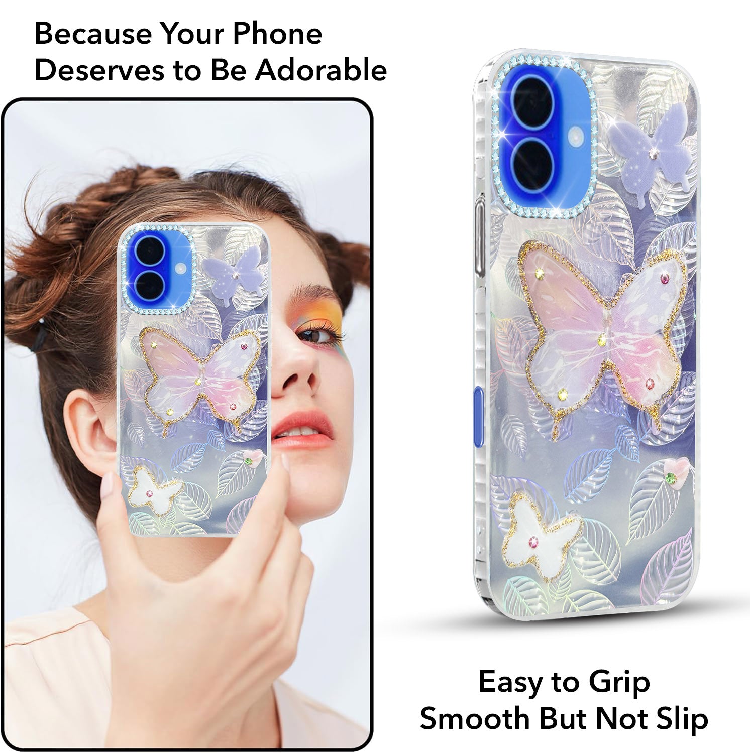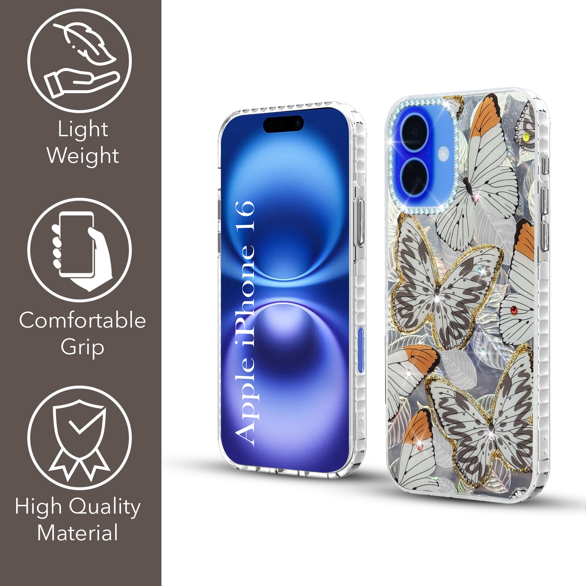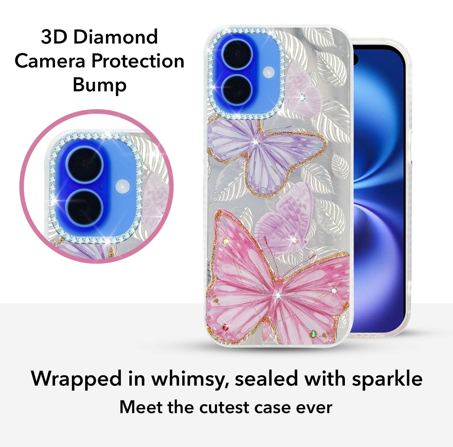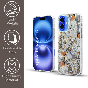 For Apple iPhone 16 Back Cover Case (Luxury Floral Glitter Cute Butterfly | Diamond Studded Camera Bump | Girls & Women Design)