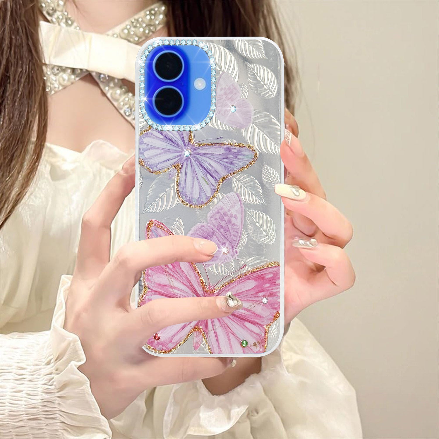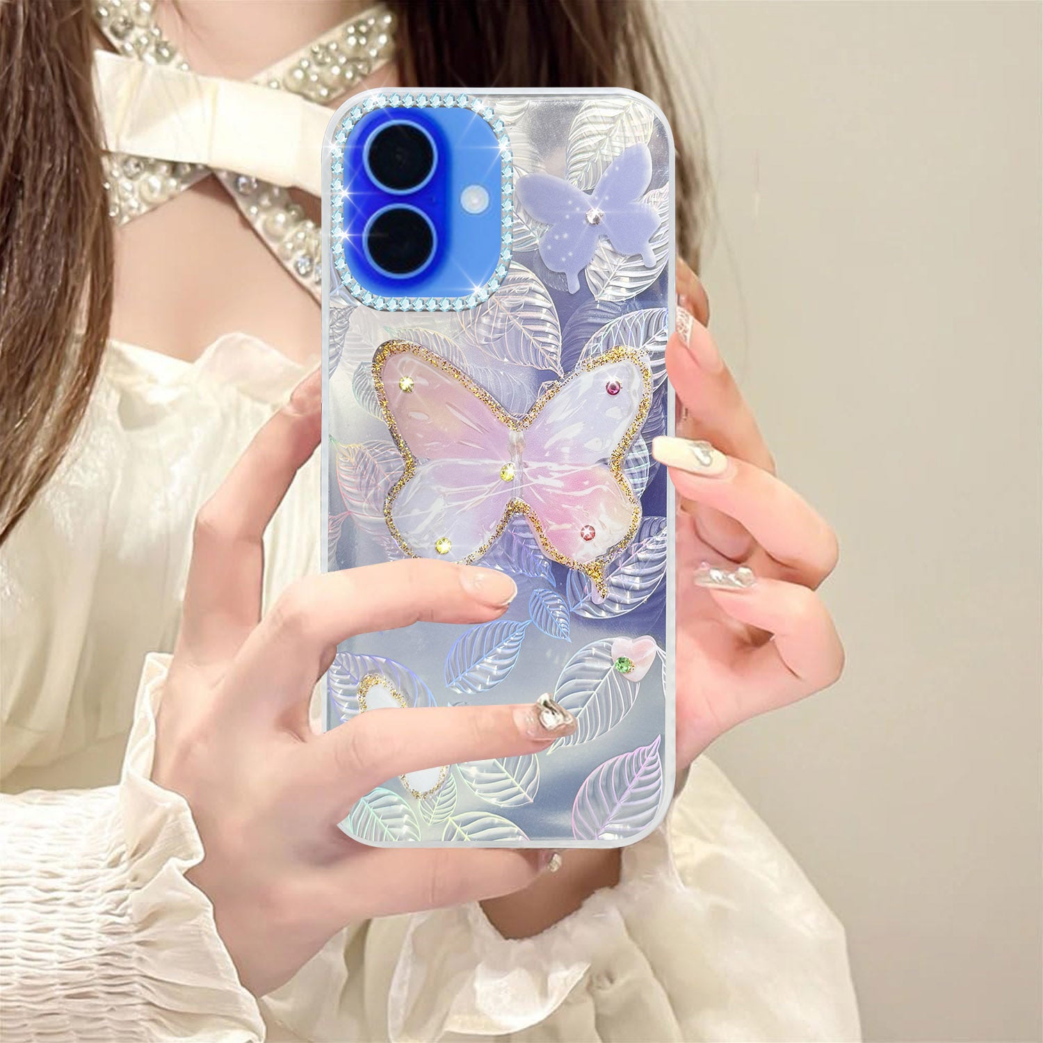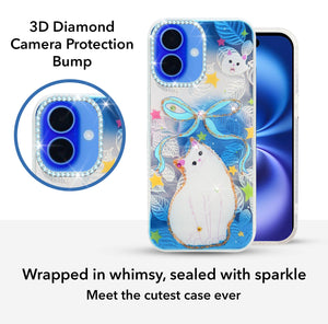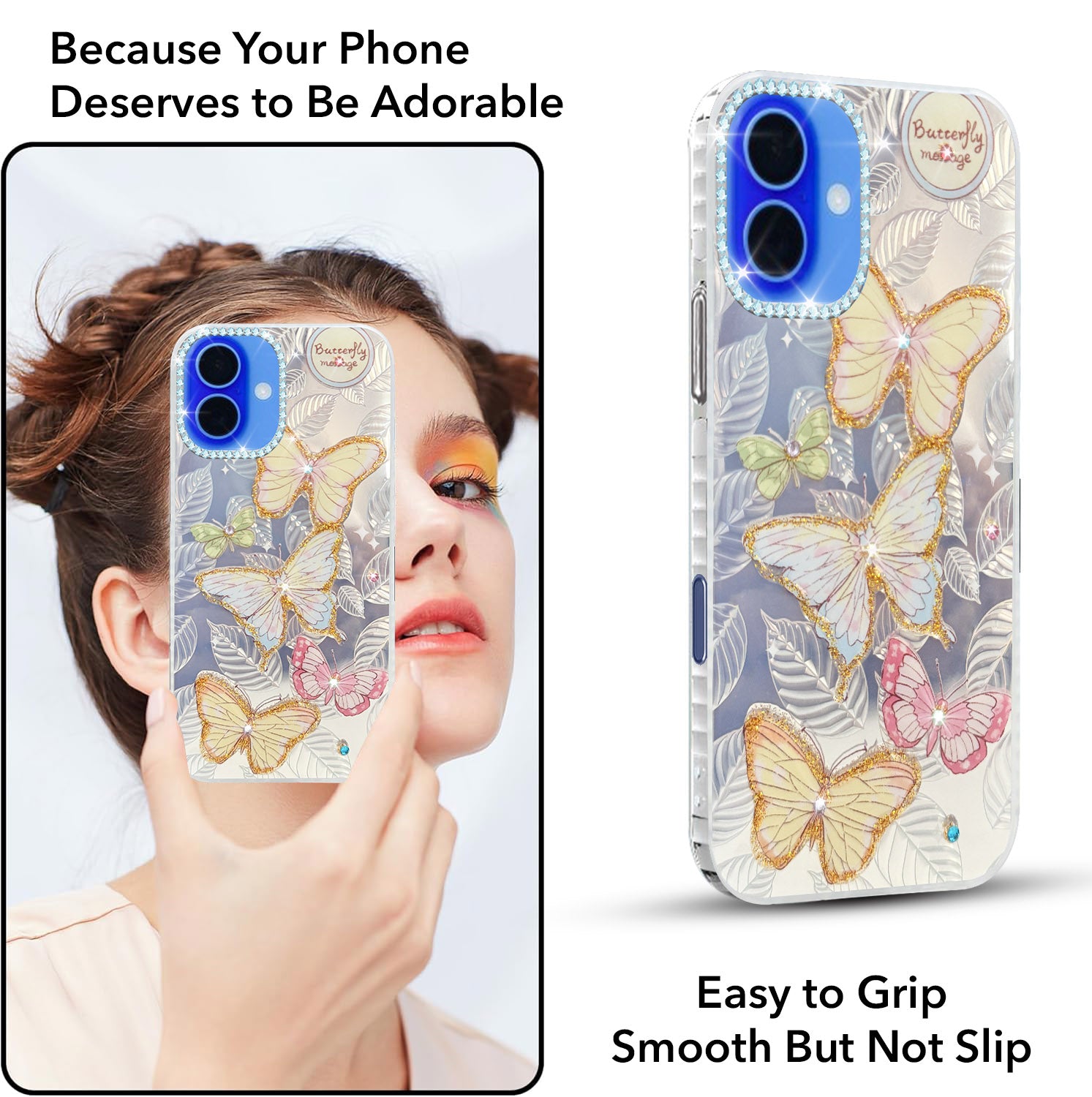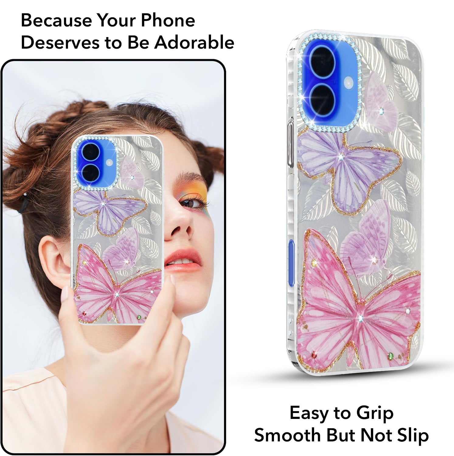 For Apple iPhone 16 Back Cover Case (Luxury Floral Glitter Cute Butterfly | Diamond Studded Camera Bump | Girls & Women Design)