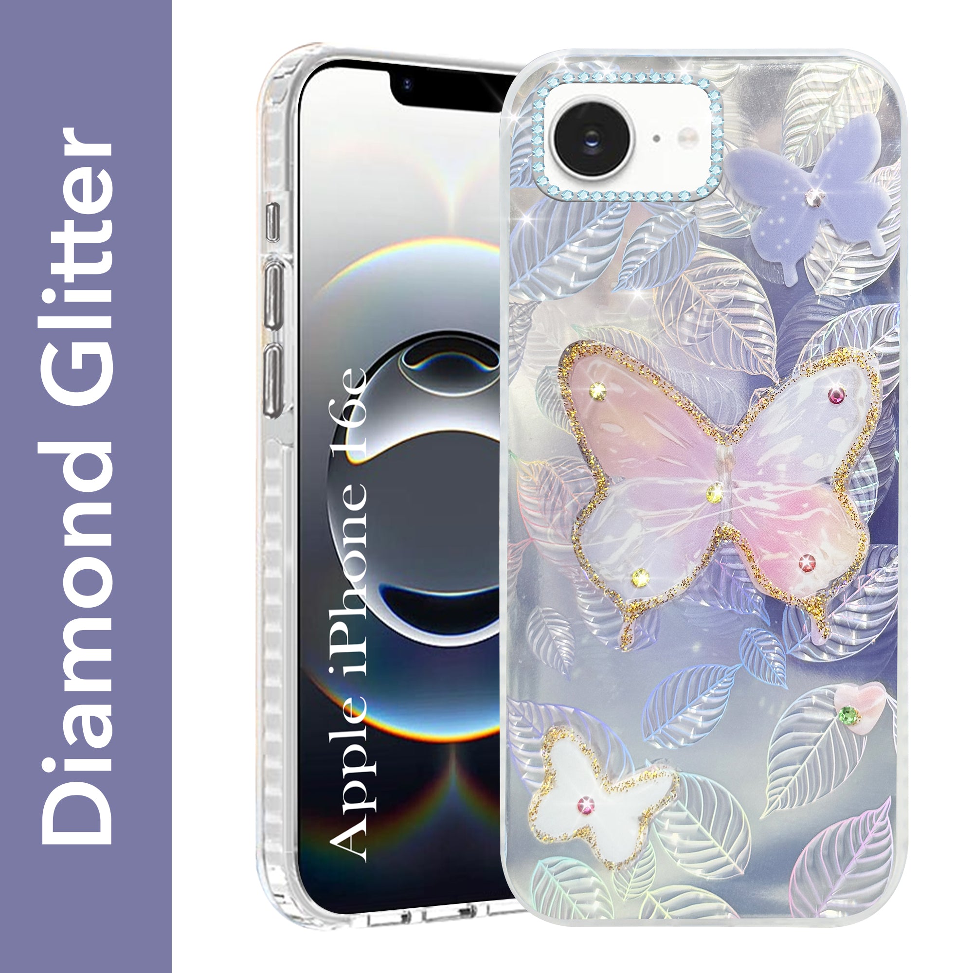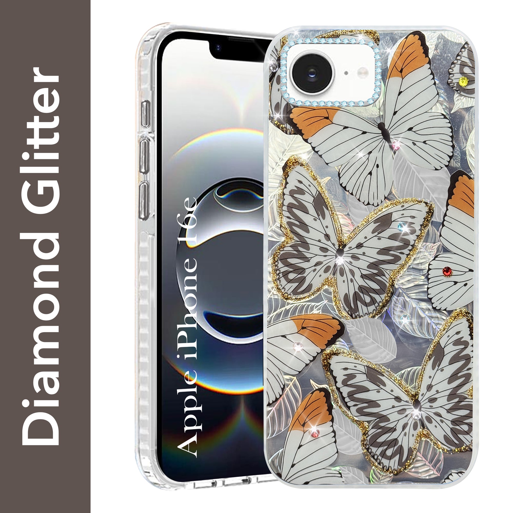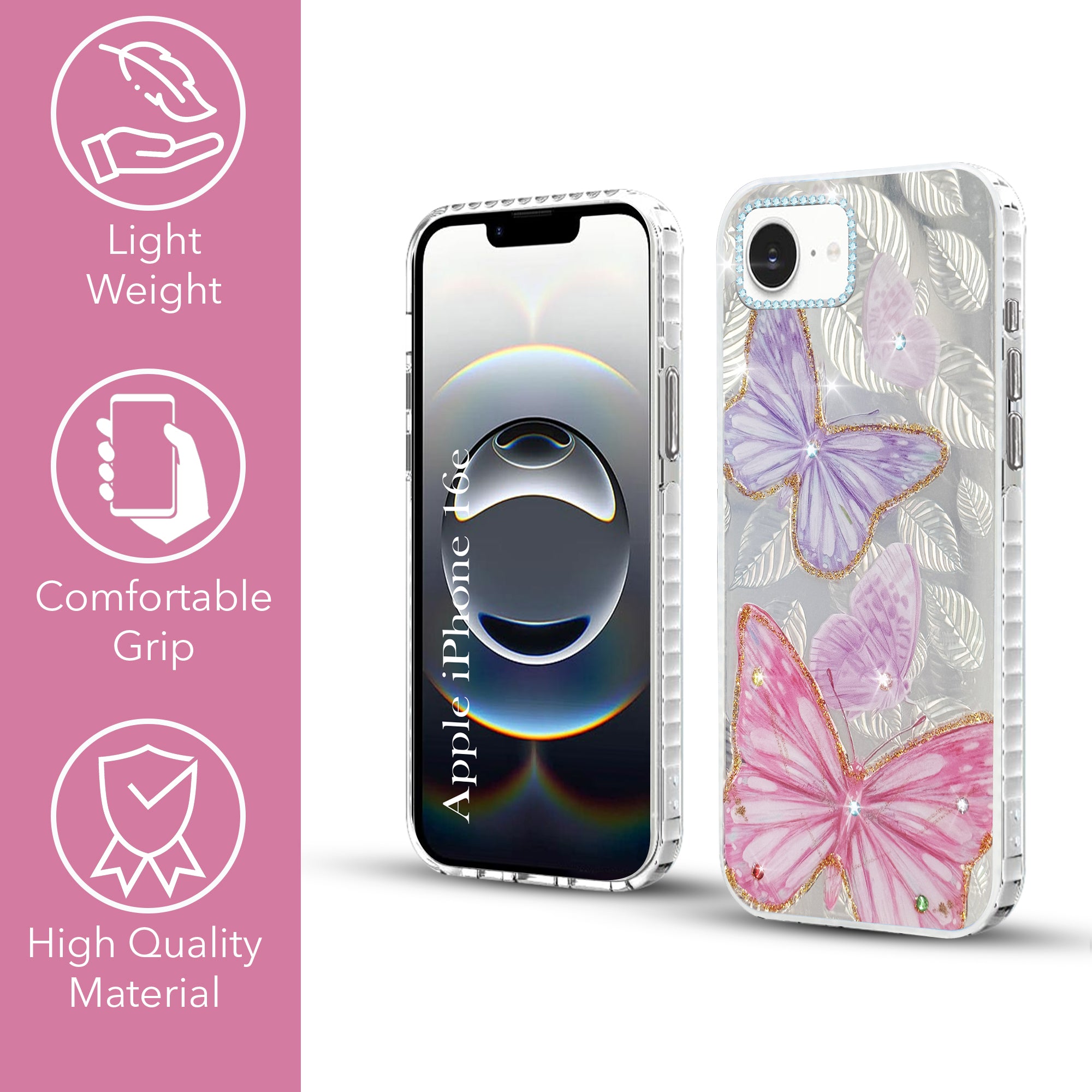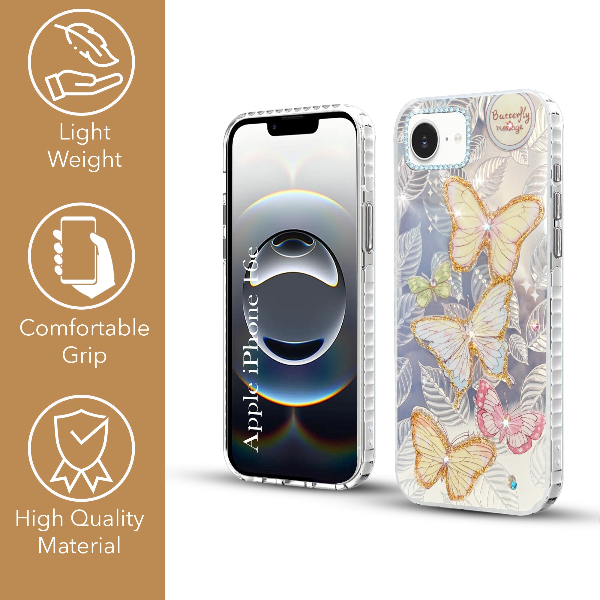 For iPhone 16e Back Cover Case (Luxury Floral Glitter Cute Butterfly | Diamond Studded Camera Bump | Girls & Women Design)