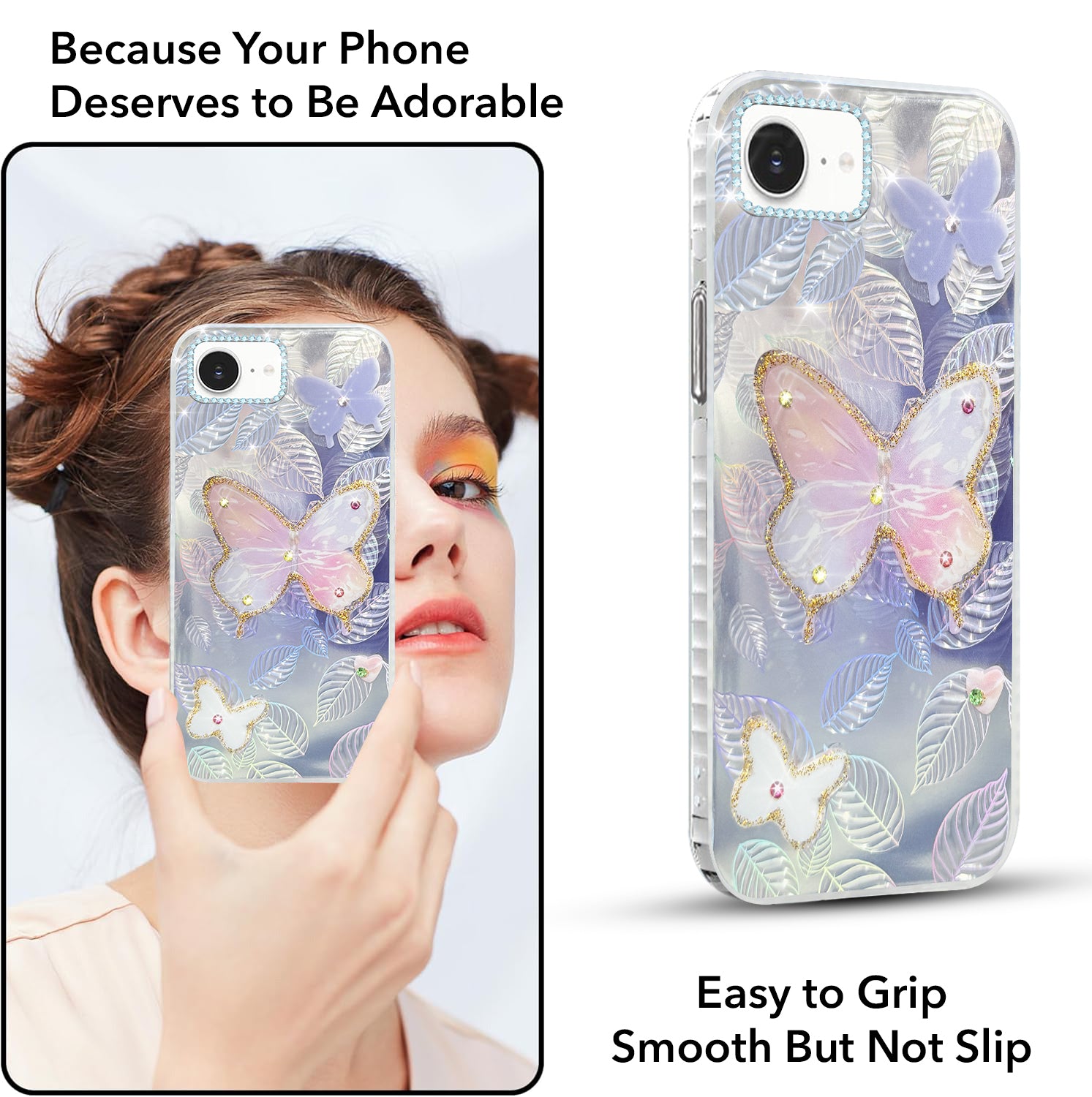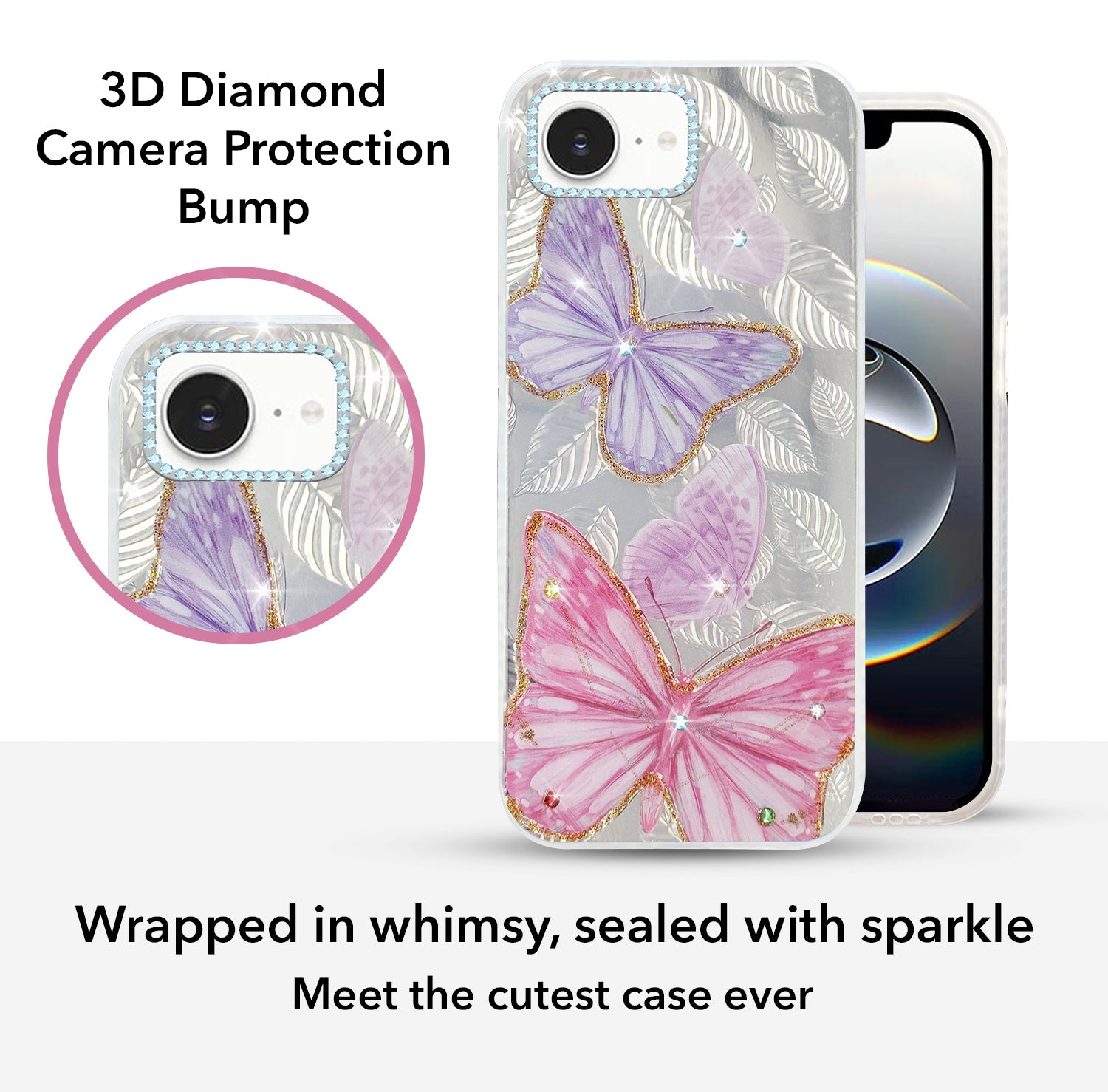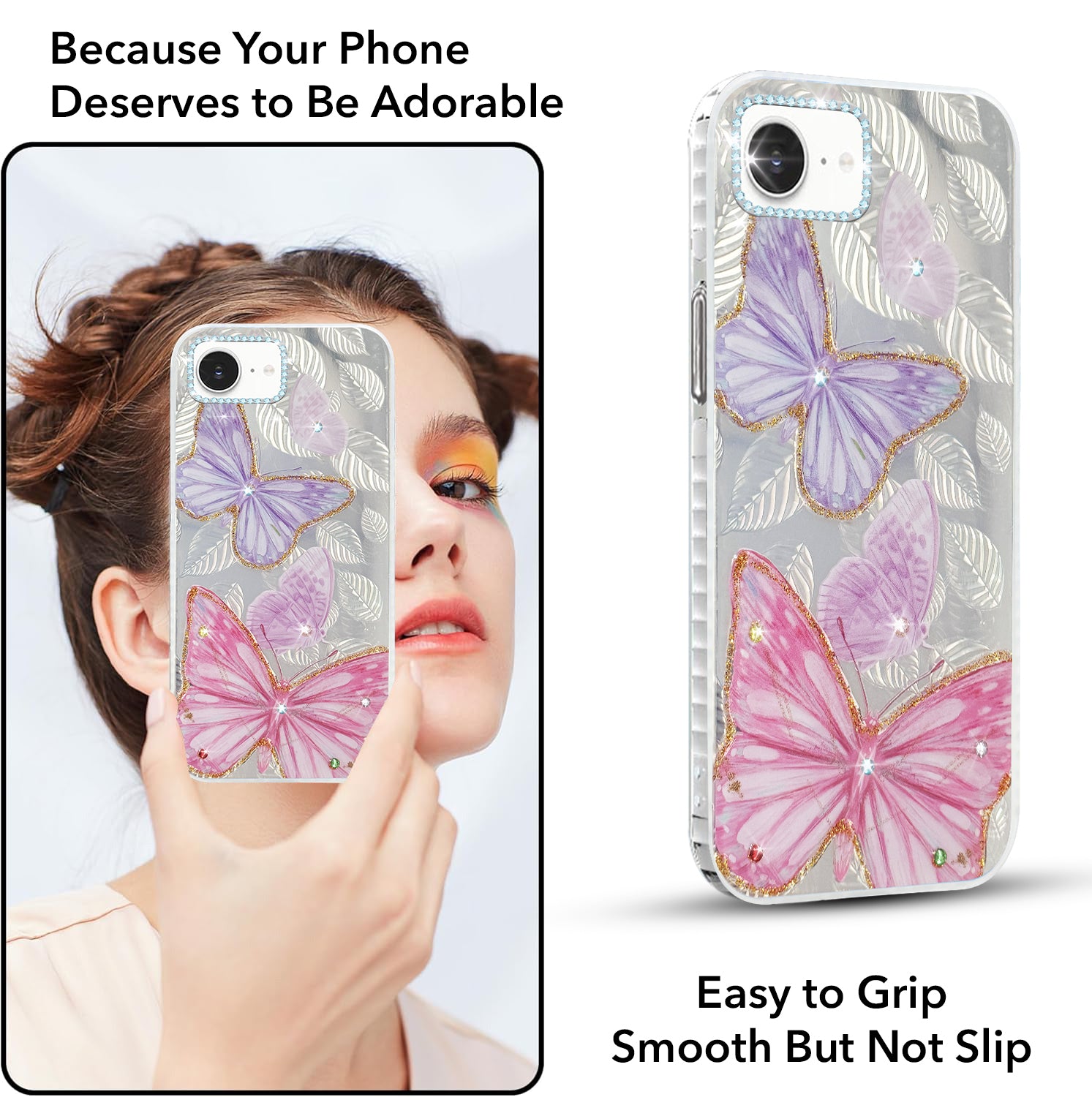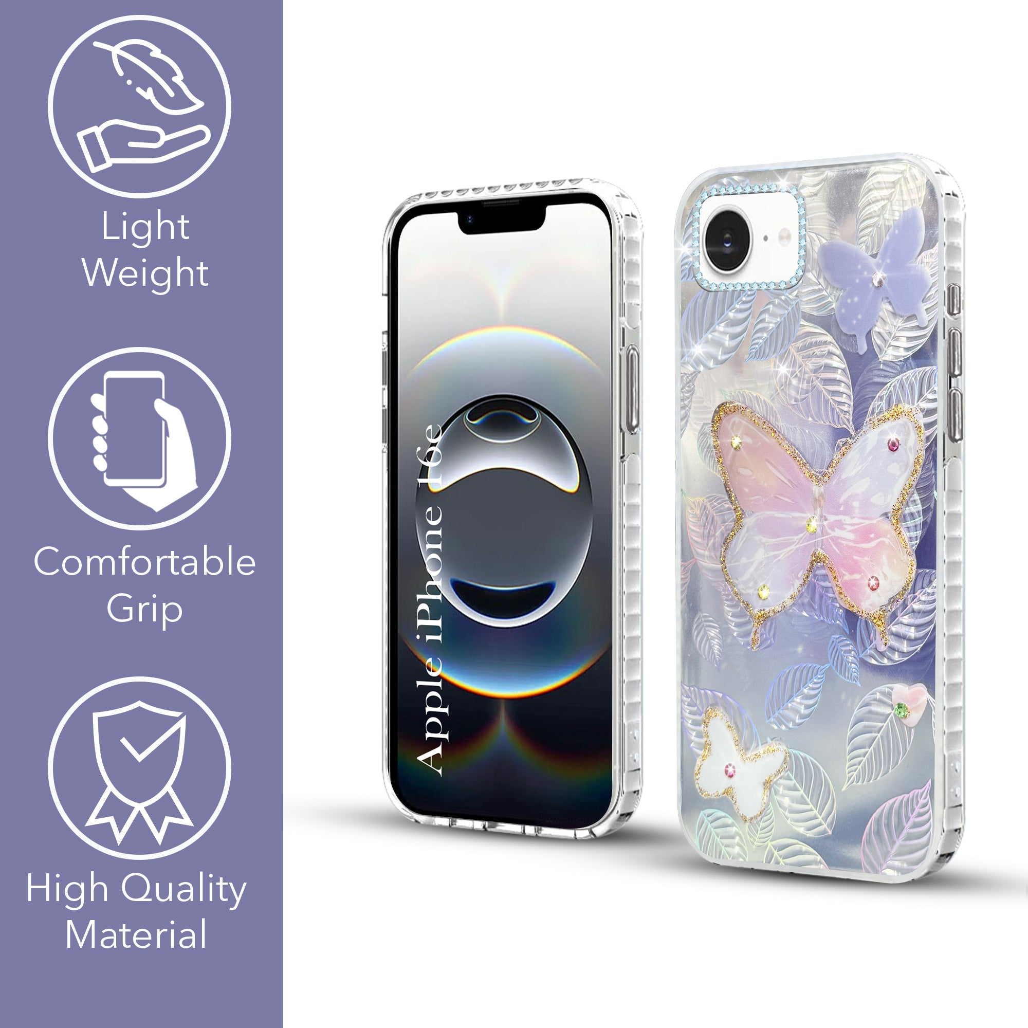 For iPhone 16e Back Cover Case (Luxury Floral Glitter Cute Butterfly | Diamond Studded Camera Bump | Girls & Women Design)