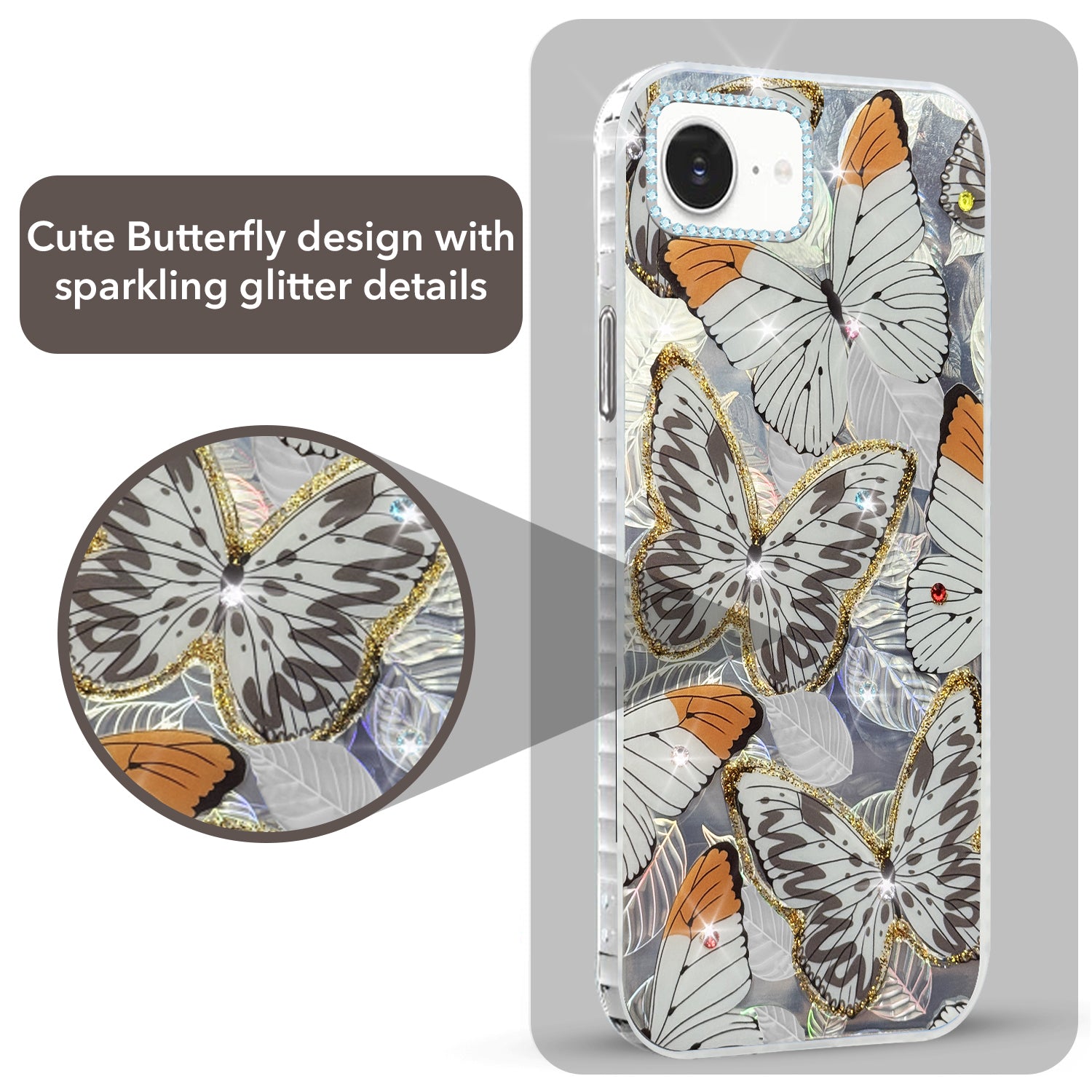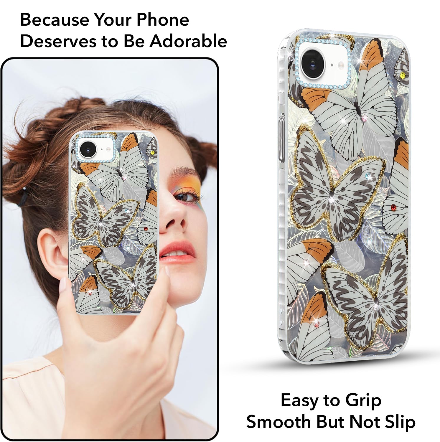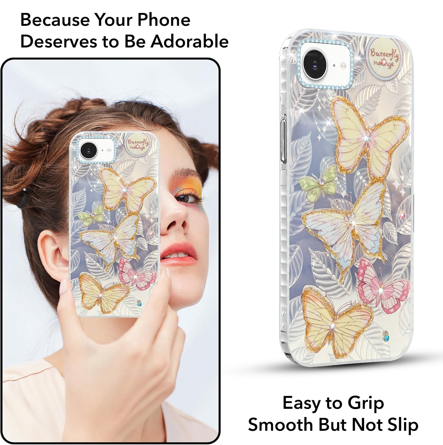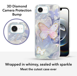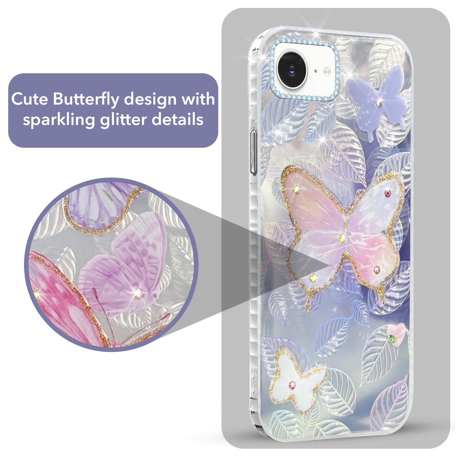 For iPhone 16e Back Cover Case (Luxury Floral Glitter Cute Butterfly | Diamond Studded Camera Bump | Girls & Women Design)