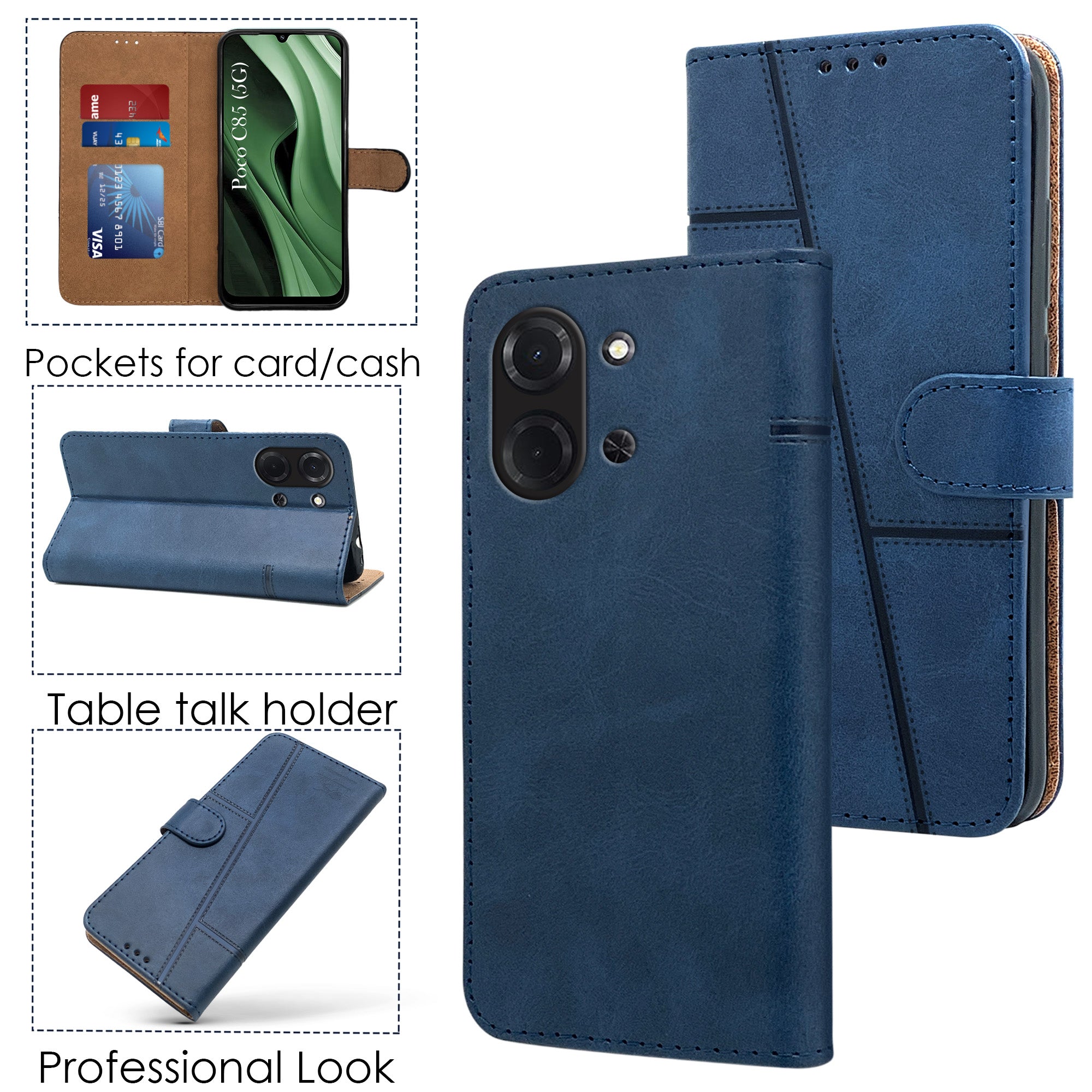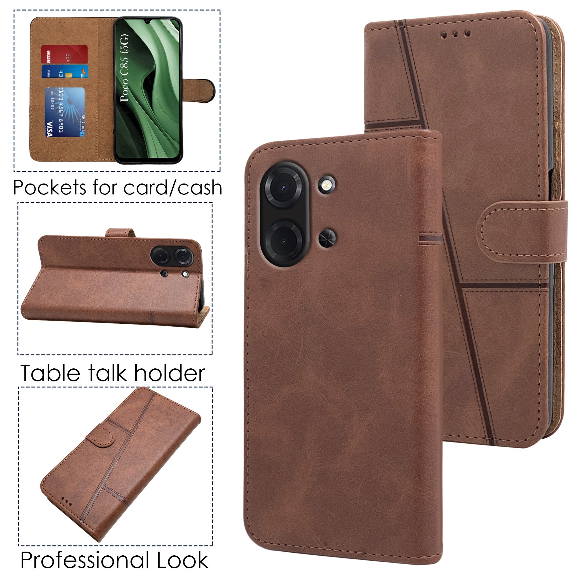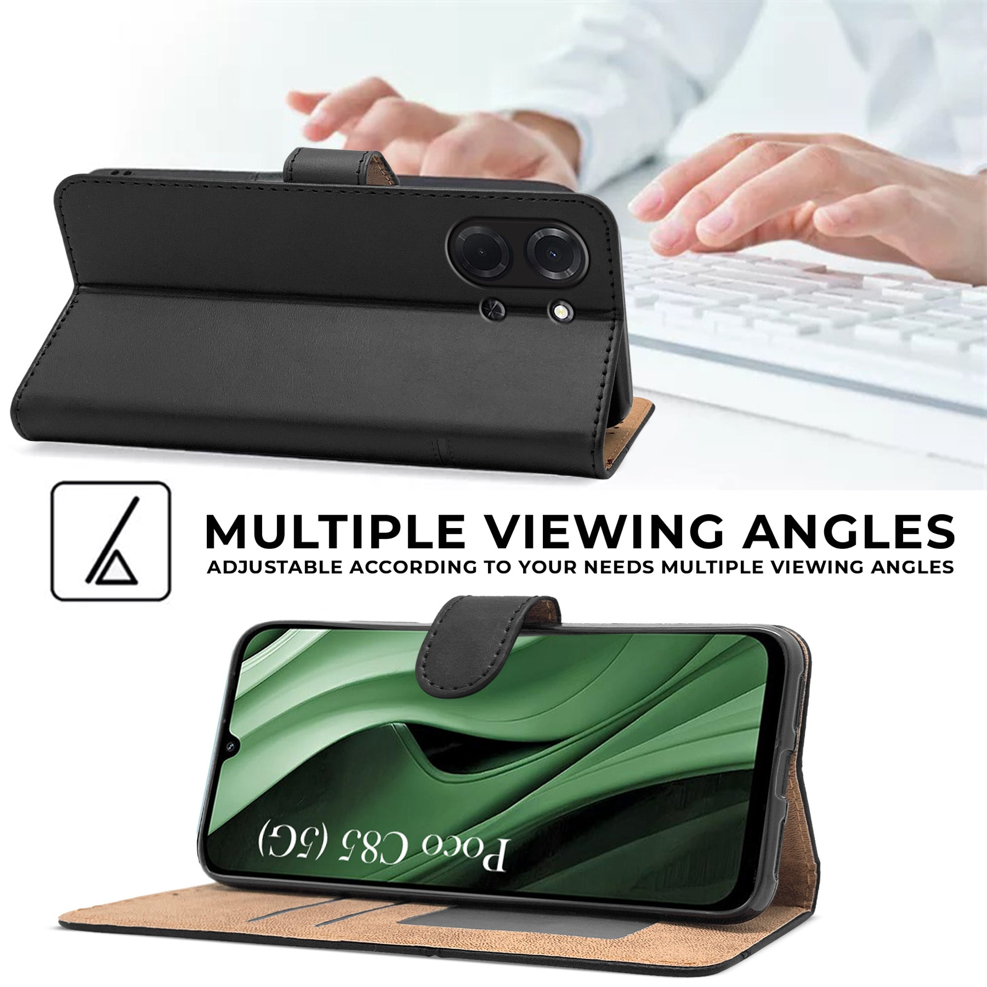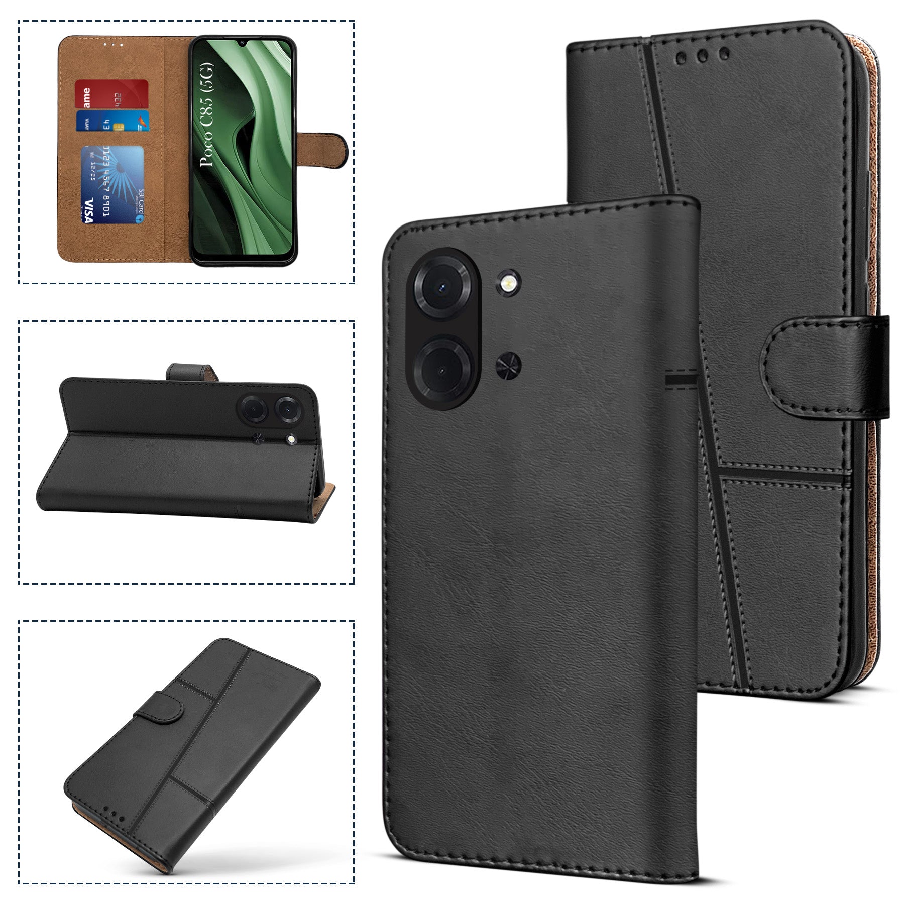 For Poco C85 5G Flip Cover Case (Stitched Leather with Magnetic Closure | Black)