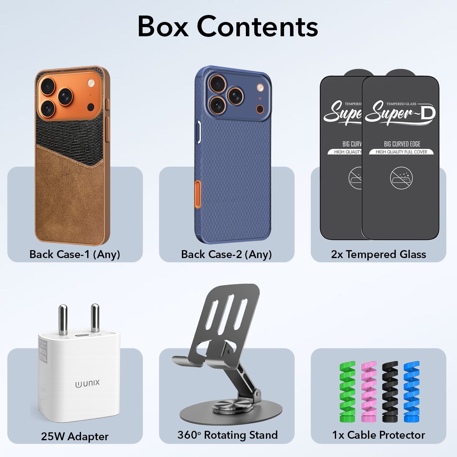 Complete Mobile Care Kit (Get Any 2 Cases+2 Tempered Glass+25W Charger Adapter+Metallic Mobile Stand+Cable Protector)