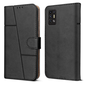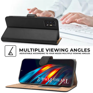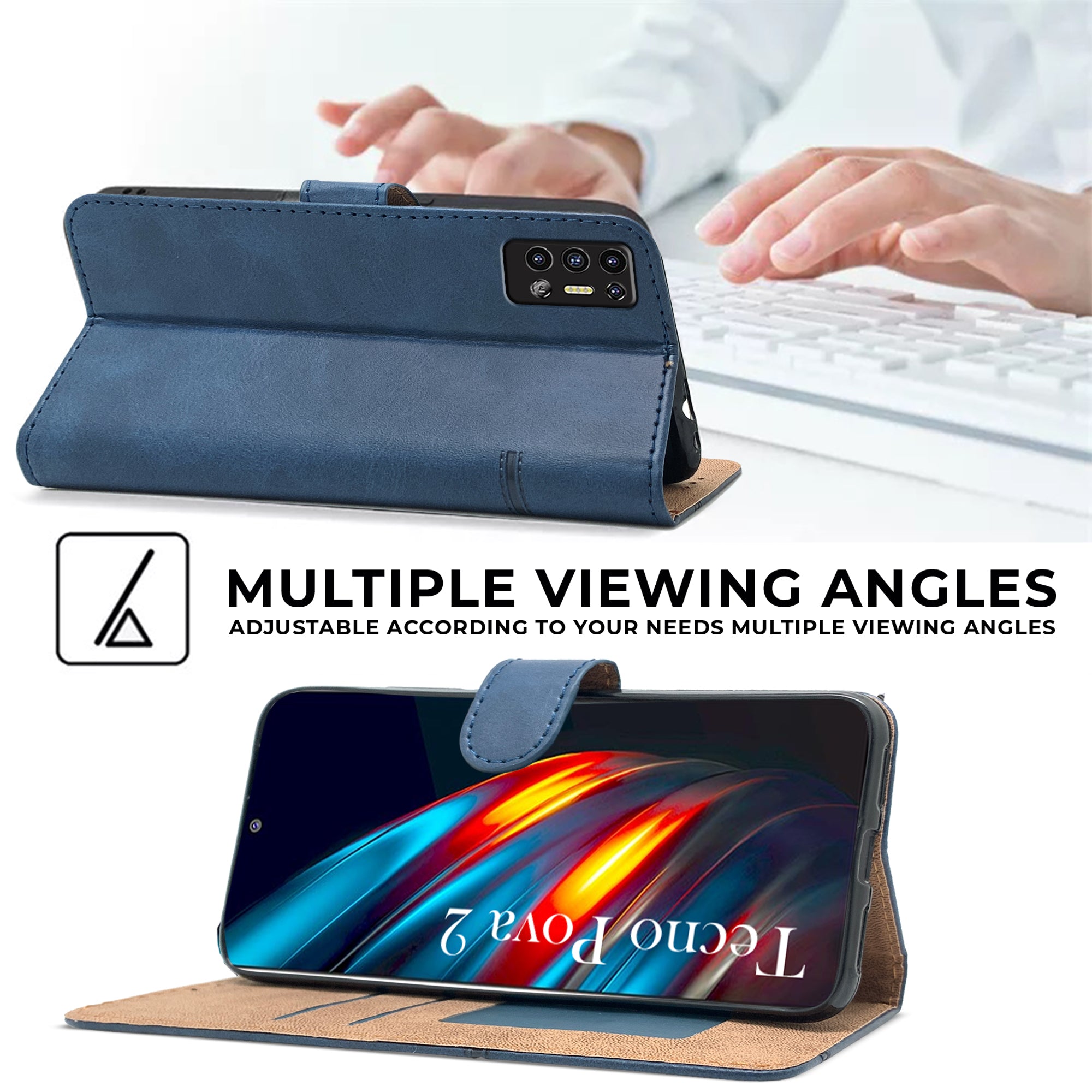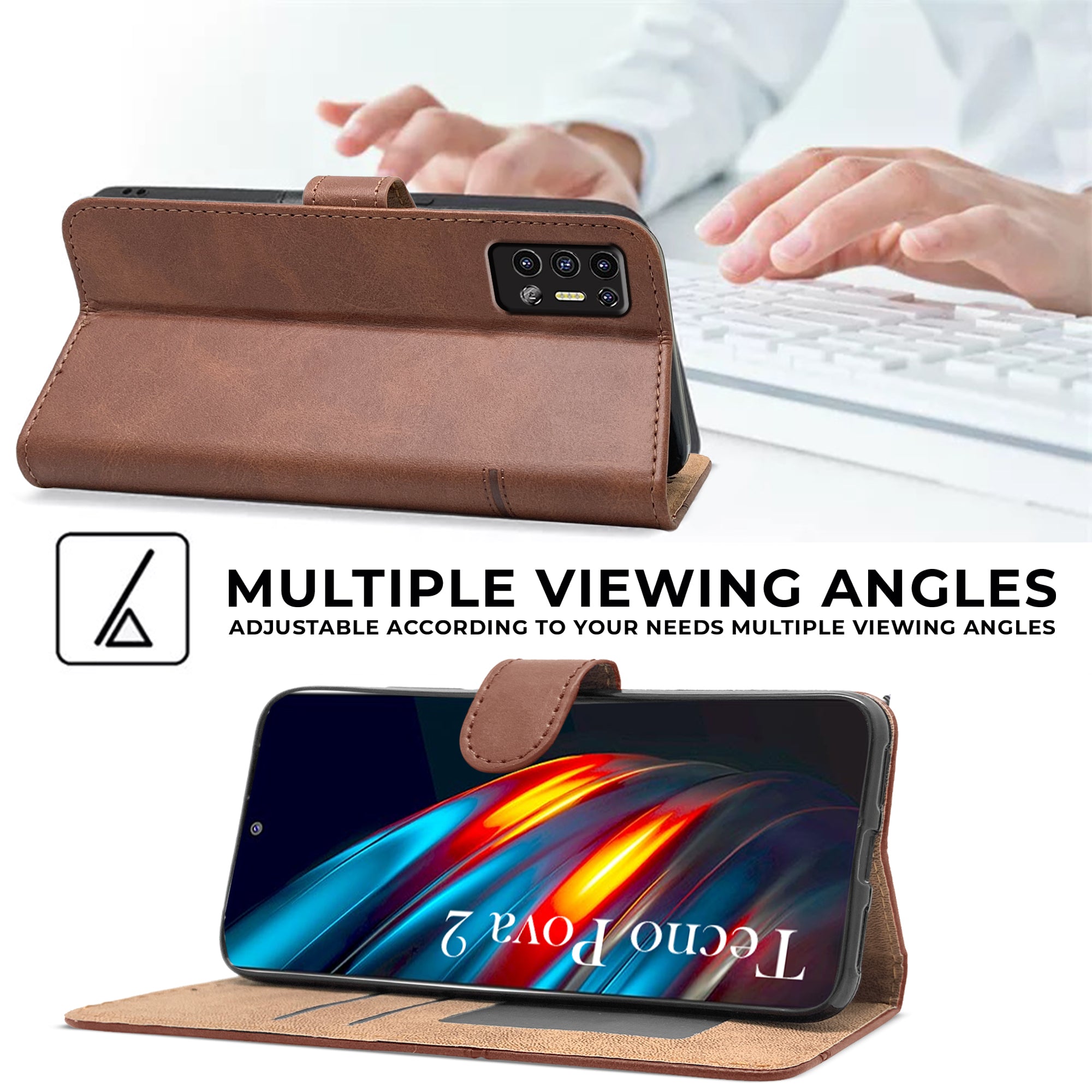 For Tecno Pova 2 Flip Cover Case (Stitched Leather Finish | Magnetic Closure | Inner TPU | Foldable Stand | Wallet Card Slots)