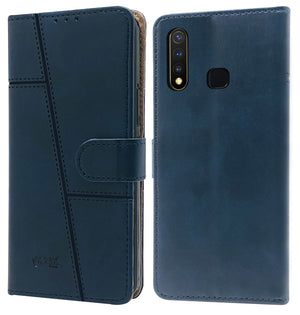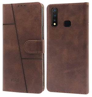 For Vivo Y19 | Y5s Flip Cover Case Stitched Leather Finish | Magnetic Closure | Inner TPU | Foldable Stand | Wallet Card Slots)